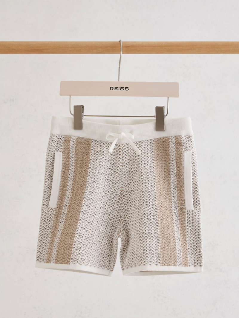 13-14 Yrs Cotton Textured-Knit Striped Shorts In Off White/Light Camel
