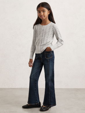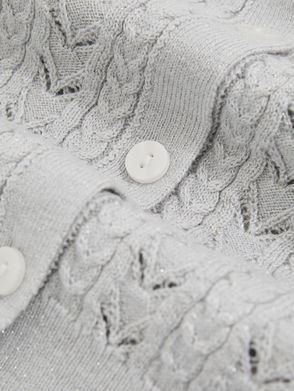 The Flo cardigan is a lightweight layer knitted from a breathable cotton and wool blend, ideal for year-round wear. Its intricate mix of cable and pointelle stitching adds delicate texture, while ribbed trims complete the look with a refined finish.