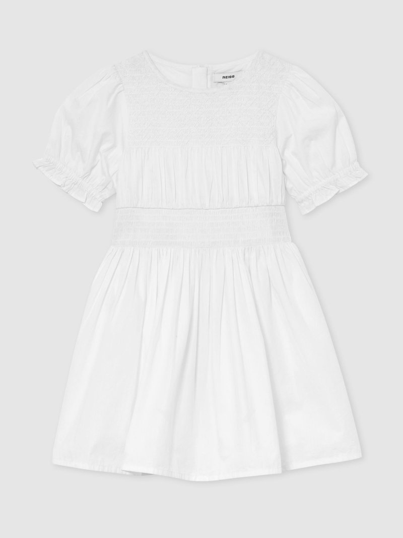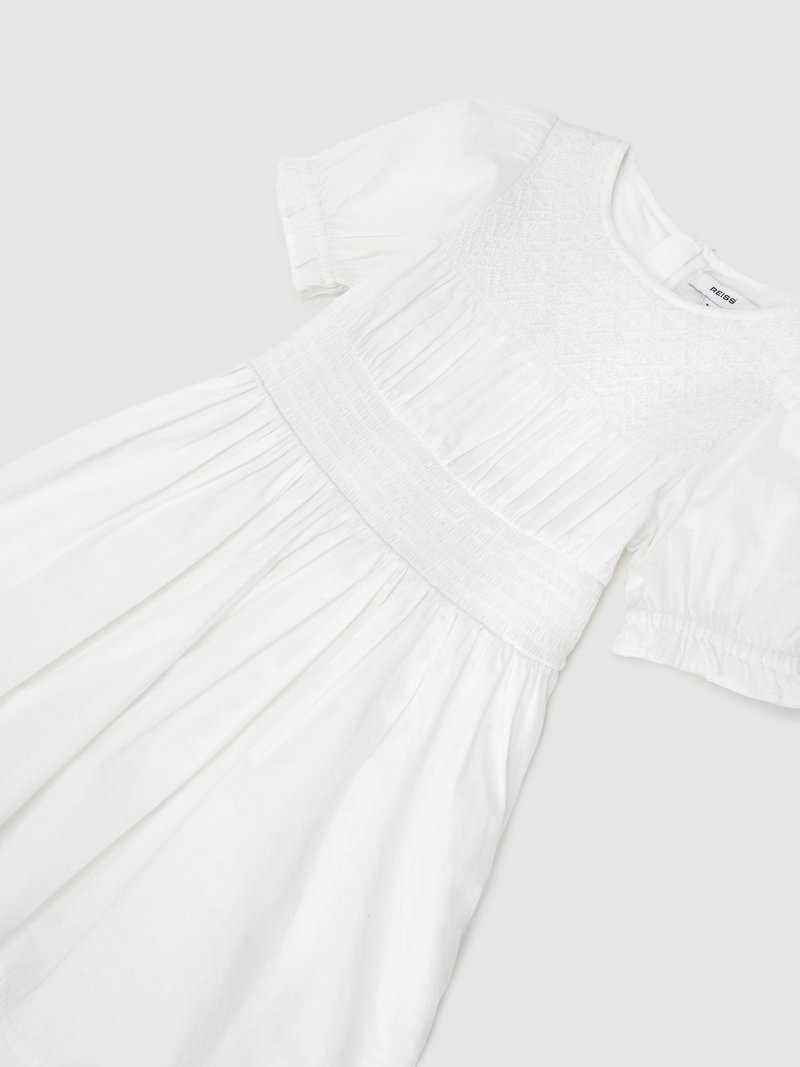3-9 Yrs Cotton Shirred Puff-Sleeve Dress In White