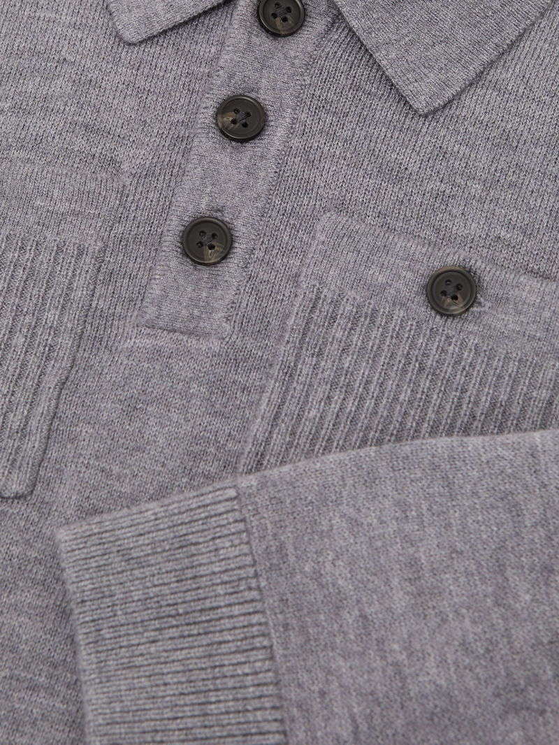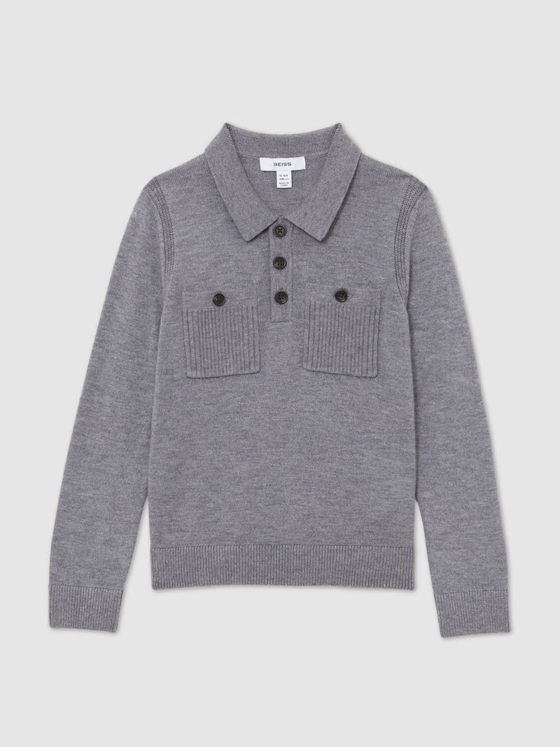 3-9 Yrs Half-Button Twin-Pocket Polo Jumper With Wool In Grey Melange