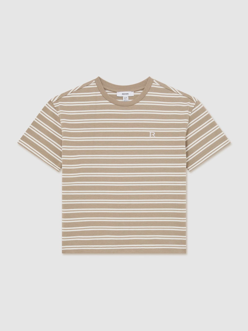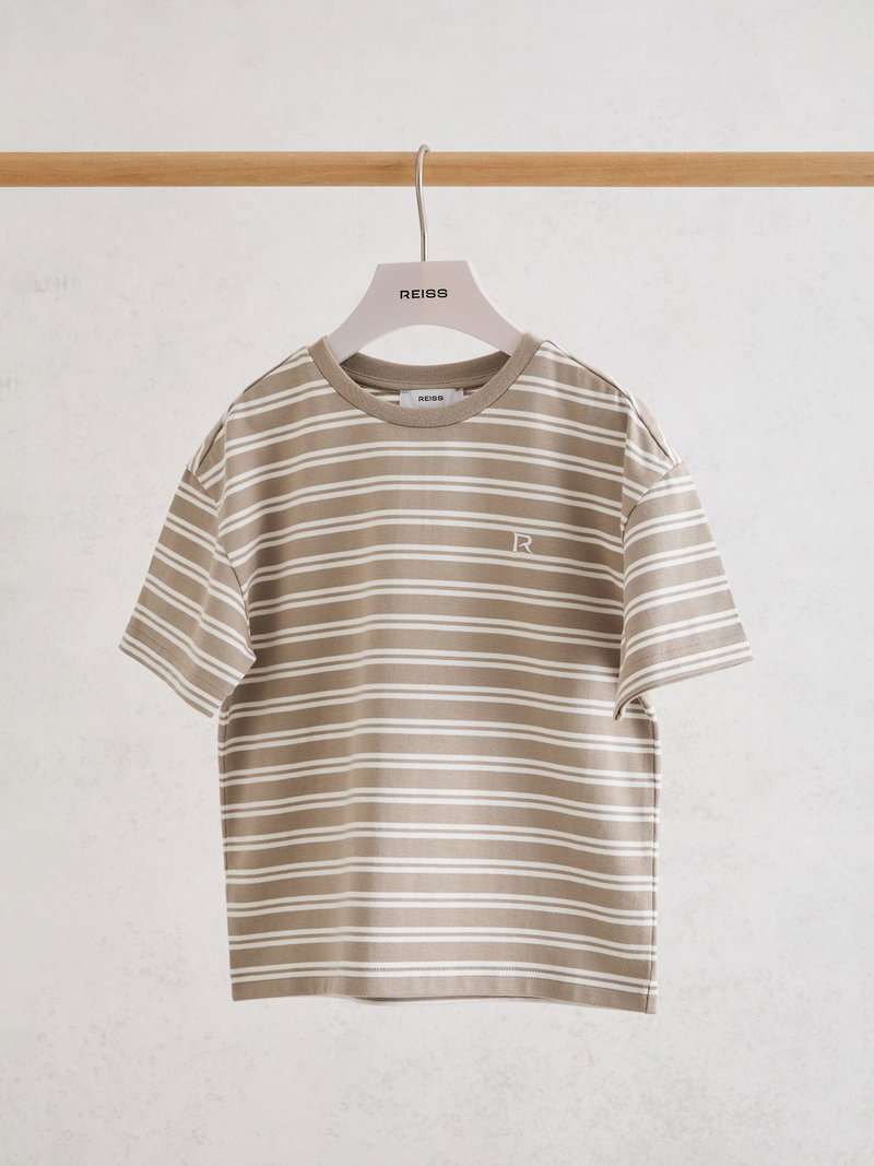 9-13 Yrs Cotton Stripe Logo-Embroidered T-Shirt In Taupe/White