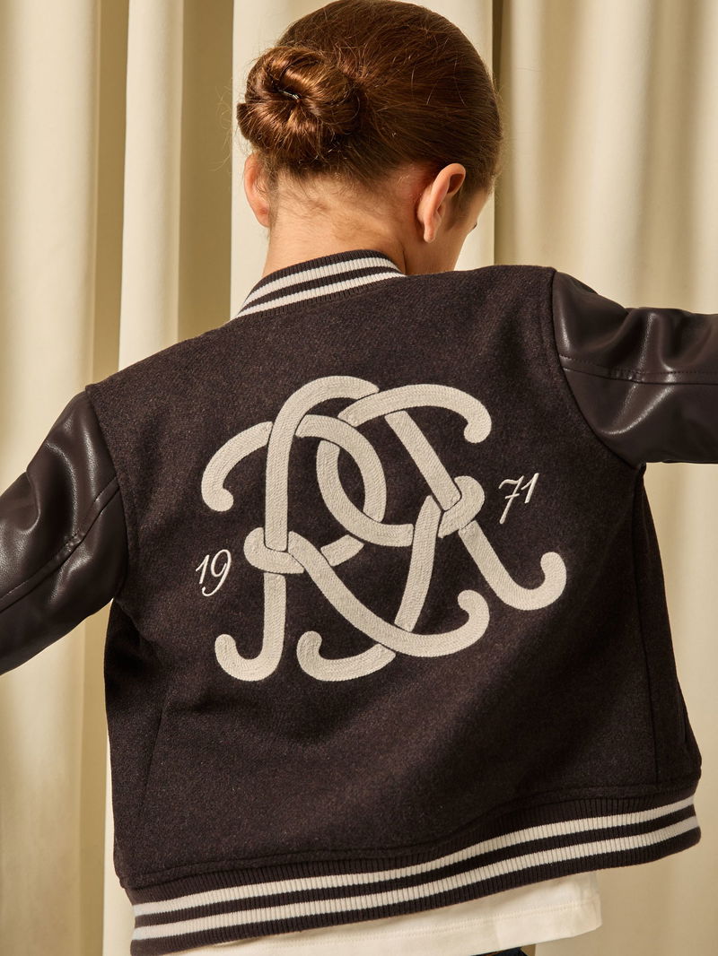 9-13 Yrs Monogram Relaxed Varsity Jacket Unisex Fit In Brown/Off White