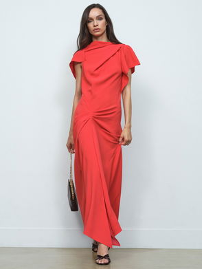 Asymmetric draping and ruched detailing at the waist create soft ripples through the Saskia dress. Contrast topstitching subtly frames the silhouette, while mismatched flounce sleeves and a side slit enhance its sense of movement. Contrast topstitching High neckline Flounce sleeves Ruched detail Side slit Concealed side zipRegular side neck.