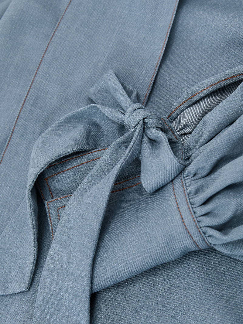 Crafted from fine twill with subtle stretch, the Charlotte blouse offers a feminine summer silhouette that drapes softly, with blouson sleeves, contrast topstitching, and a tied neckline and cuffs.