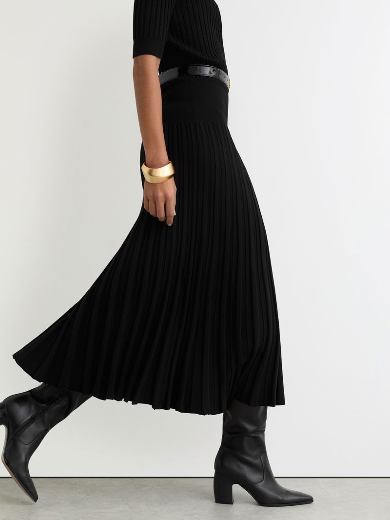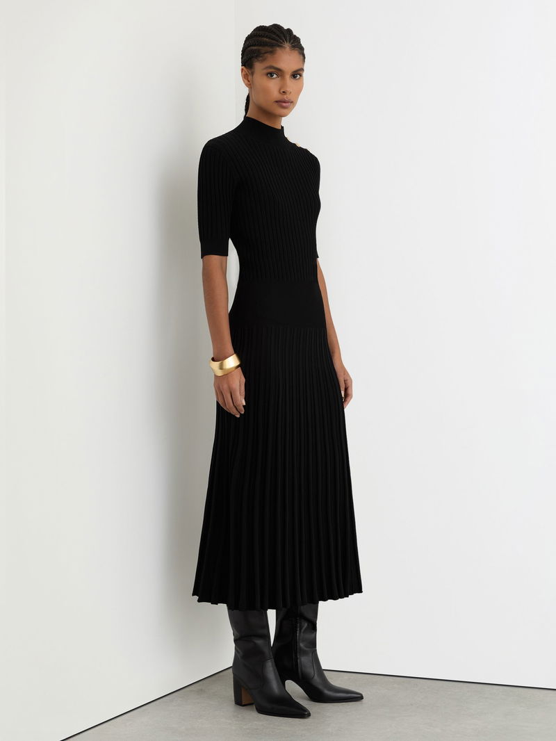 The Harriet dress is rib-knitted with a high neckline and short sleeves. Crest-embossed press-studs accent the shoulder, while a pleated skirt creates a refined silhouette.