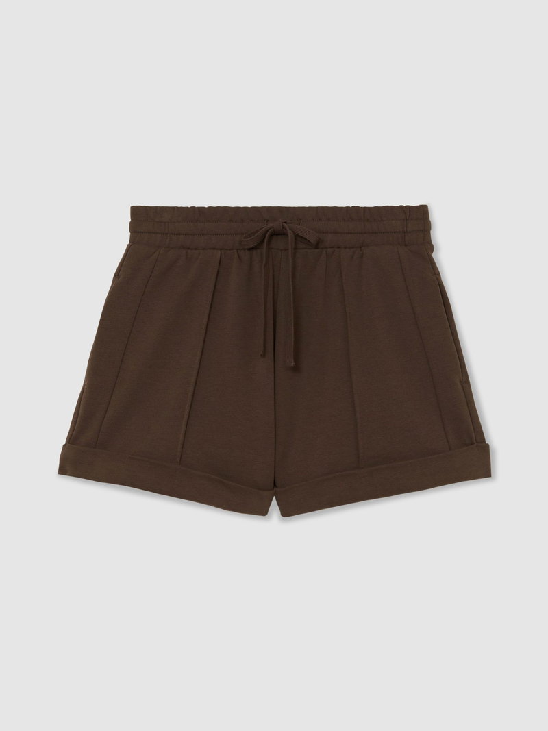 The Chocolate Brown Willa shorts are a relaxed everyday style, crafted from a soft loopback jersey. An elasticated drawstring waist and front pintucks are complemented by cuffed hems.