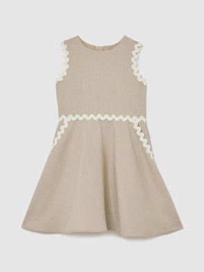 The White Odela dress is crafted from cotton with a broderie anglaise collar and contrast trim. A gathered waist creates a full skirt, finished with a concealed half-button placket.