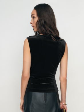 The Rue top is made from a stretchy woven fabric with a draped front. Designed with a ruched bodice and fitted sleeves to enhance the silhouette.