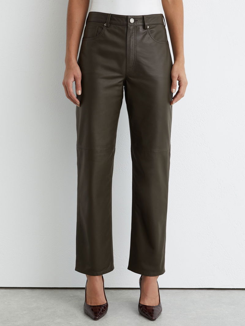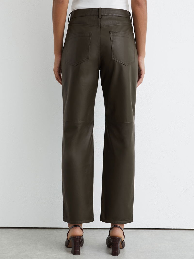 Leather Slim-Leg Trousers In Khaki Green