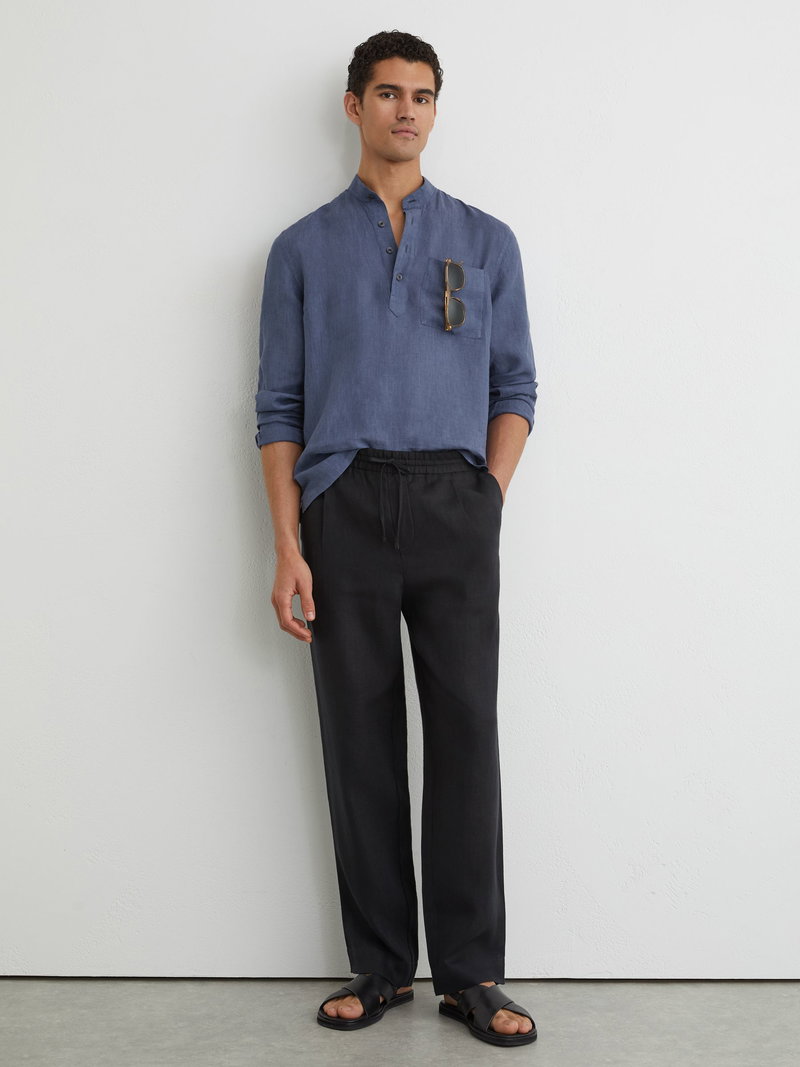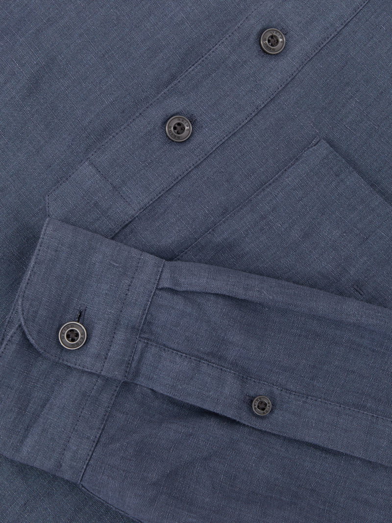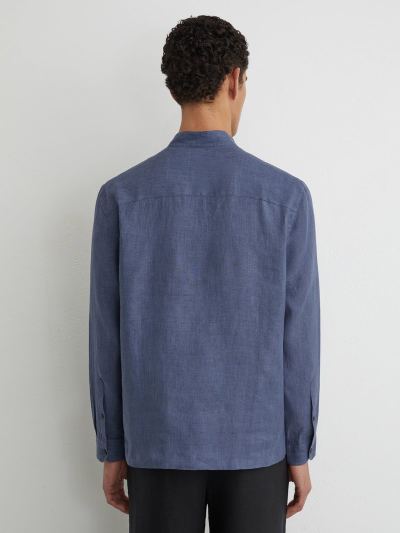 Linen Grandad-Collar Half-Button Shirt Regular-Fit In Denim Blue