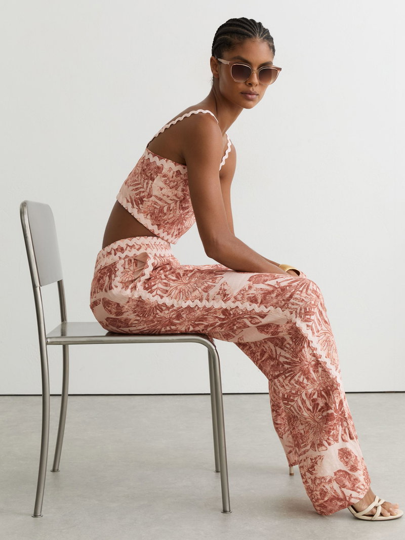 Linen Wave-Trim Wide-Leg Trousers In Pale Pink