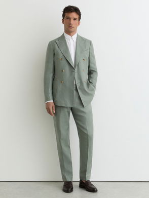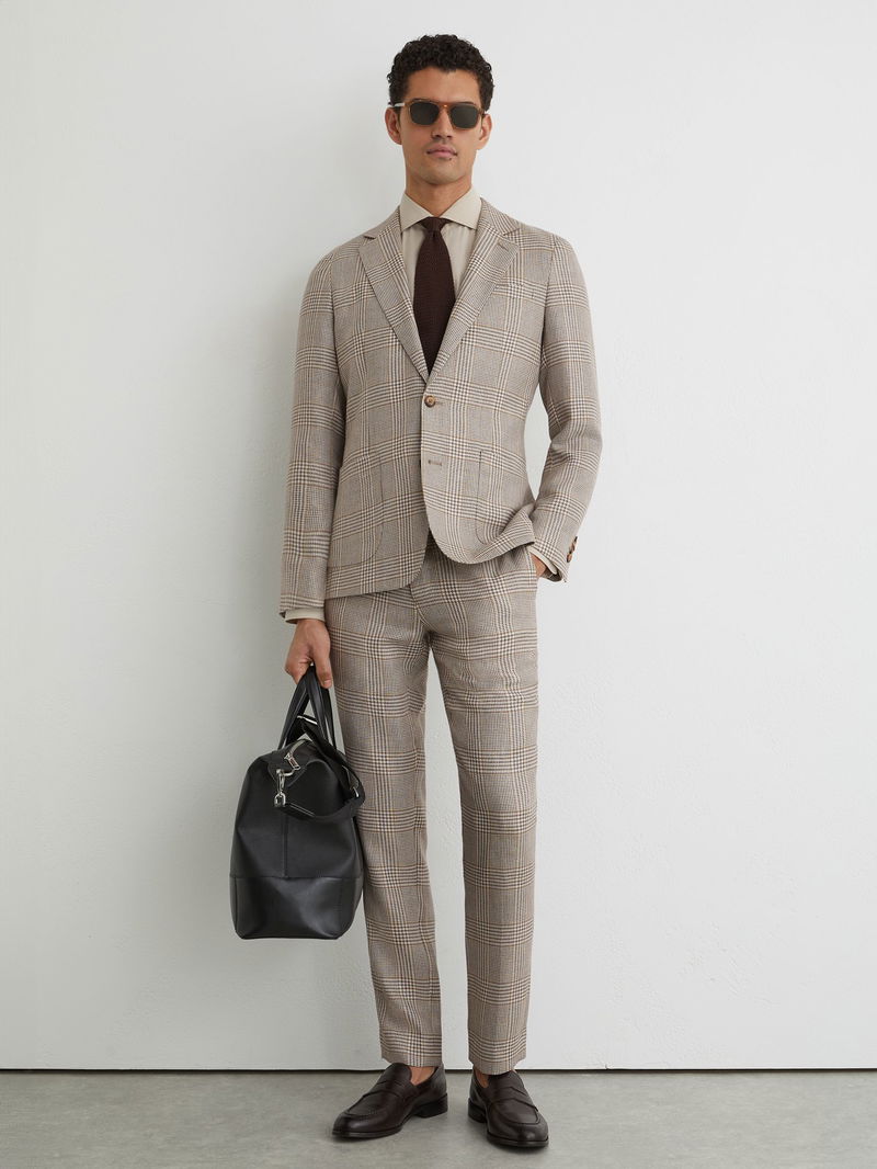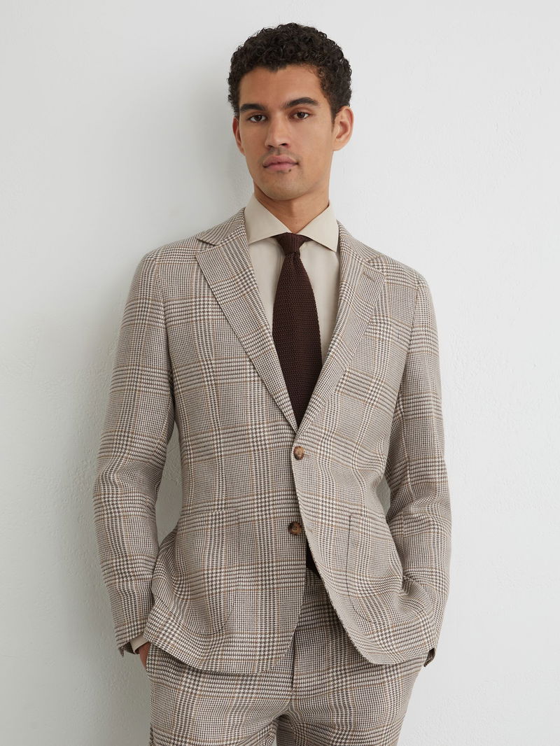 Linen-Wool Single-Breasted Check Blazer Tailored-Fit In Oatmeal Brown