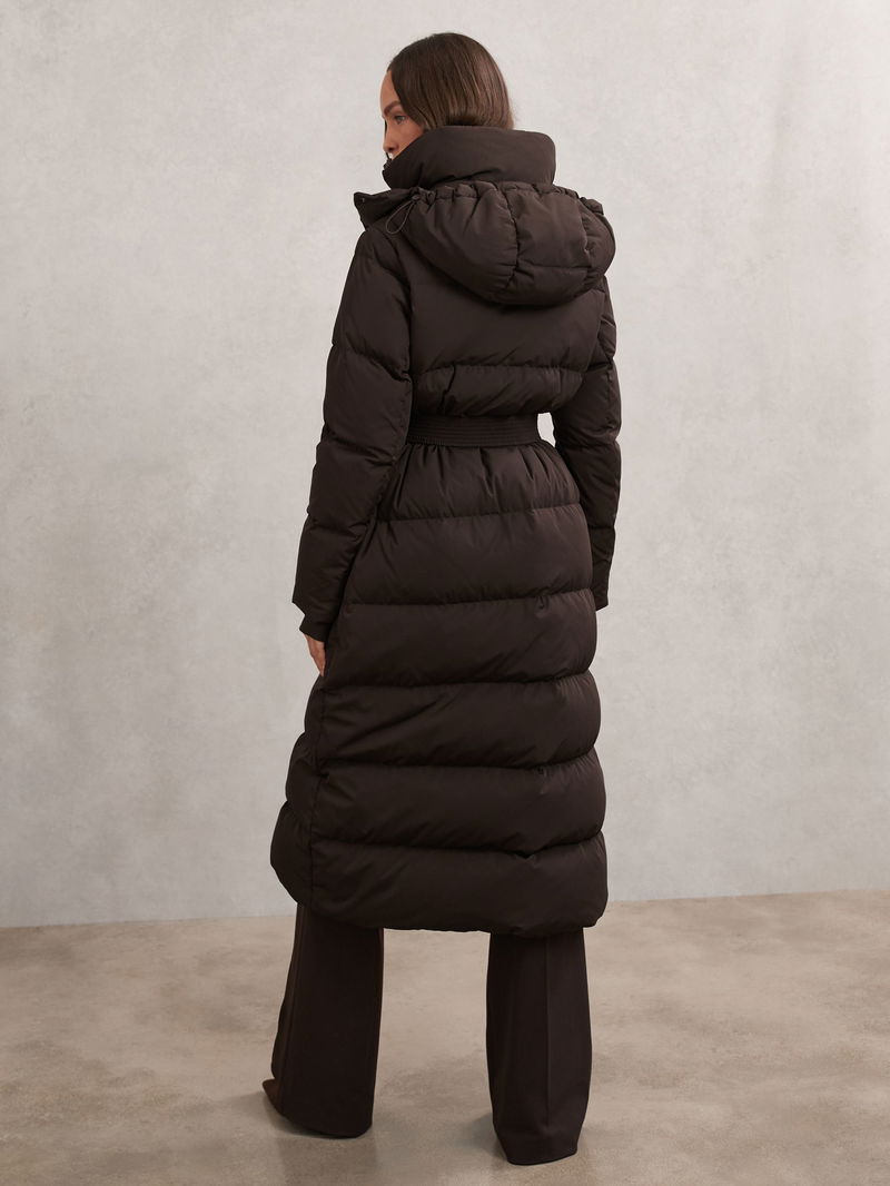Petite Belted Longline Hooded Puffer Coat In Chocolate Brown