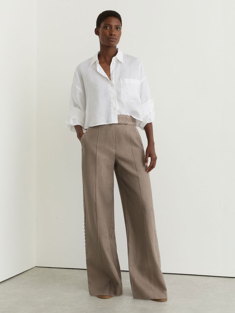 Petite Linen Wave-Trim Wide-Leg Trousers In Taupe Neutral