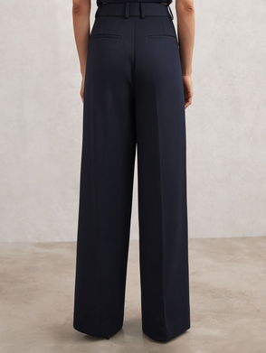 The Aubergine Solene trousers offer an effortlessly modern take on classic tailoring, cut from a wool-blend twill fabric to a fluid, wide-leg silhouette. Pressed creases and pick-stitched side pockets enhance their polished appeal.