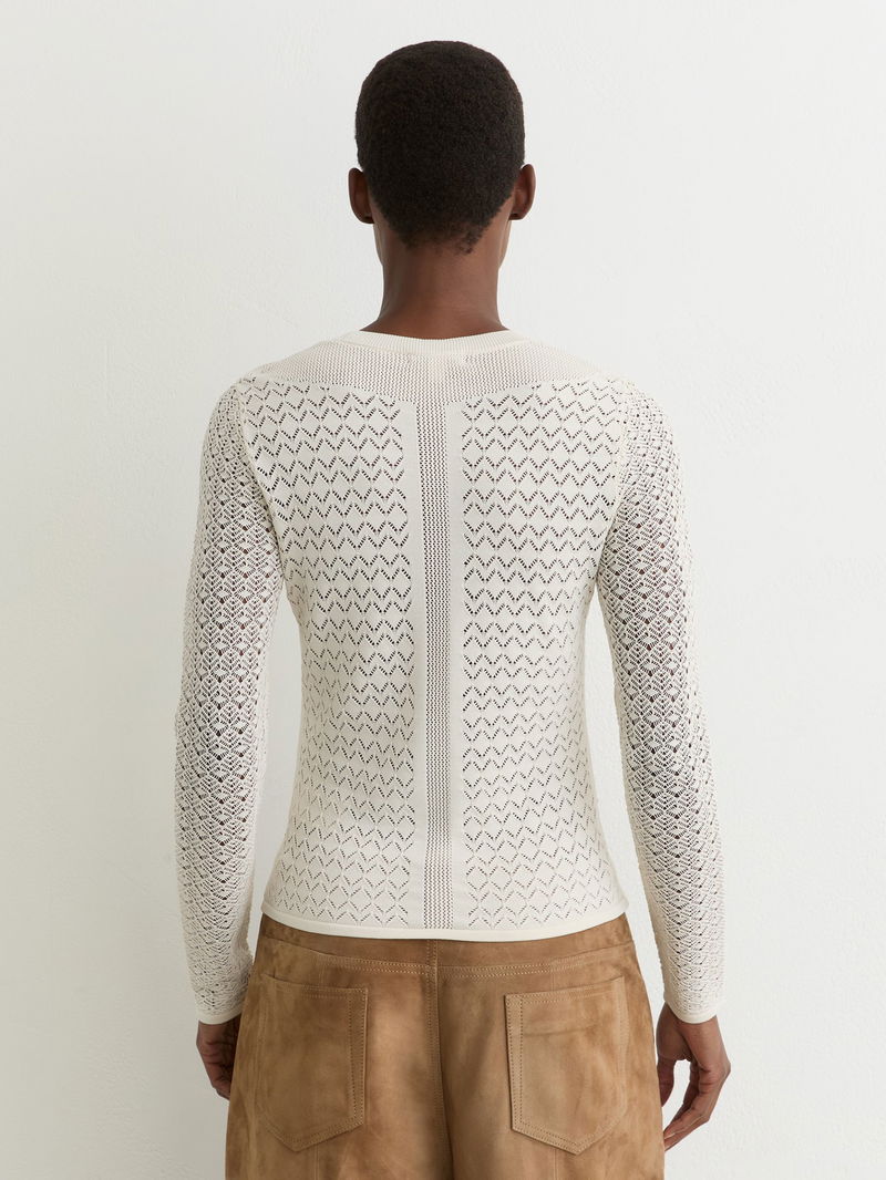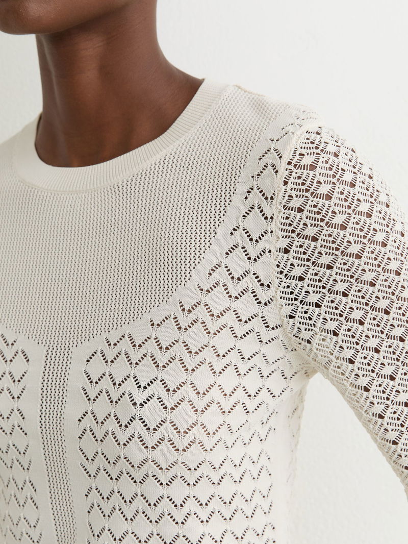 The Bella top is crafted with panels of decorative pointelle-knit for a richly textured effect. Its lightweight knit has a close fit, with fine ribbing at the neckline, hem and cuffs.