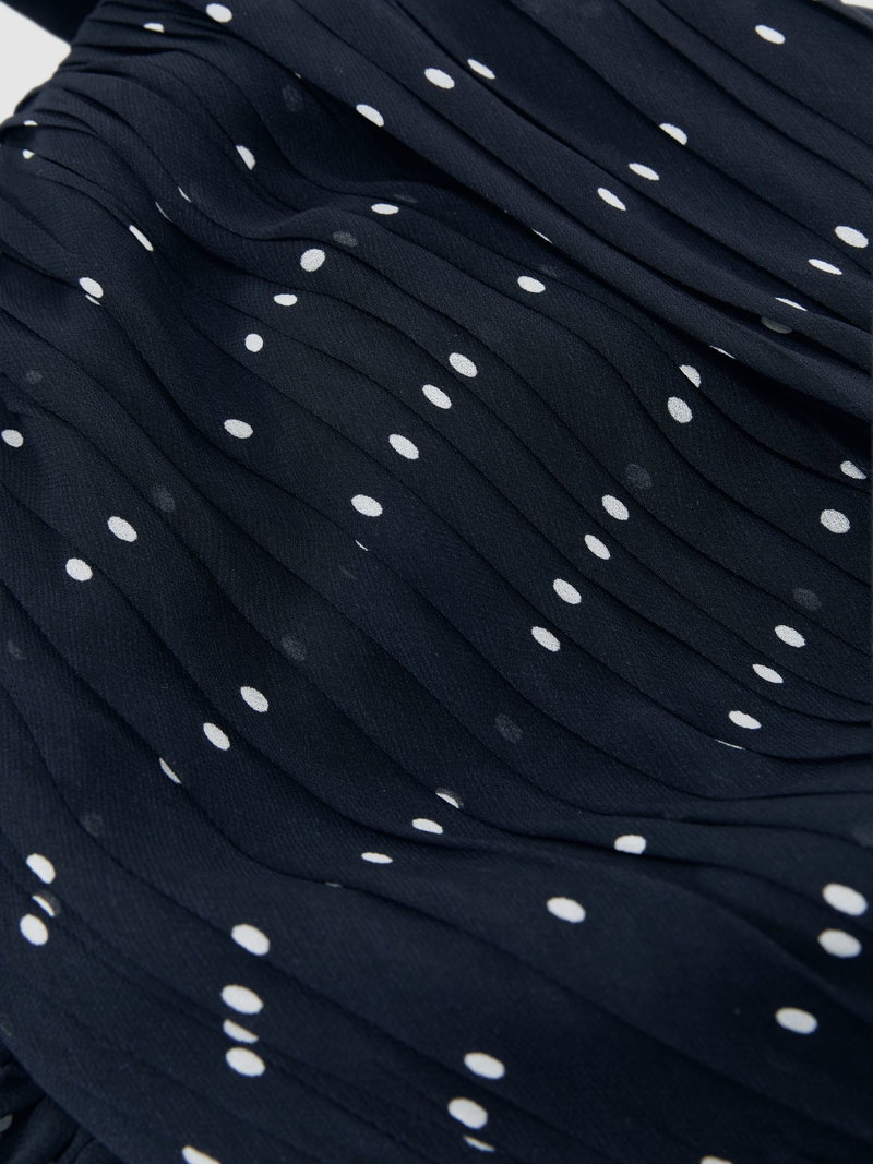 The Margo jumpsuit combines a striking off-shoulder silhouette with a playful polka-dot print. A ruched bodice flows into a wide leg, with lightweight chiffon creating soft movement.