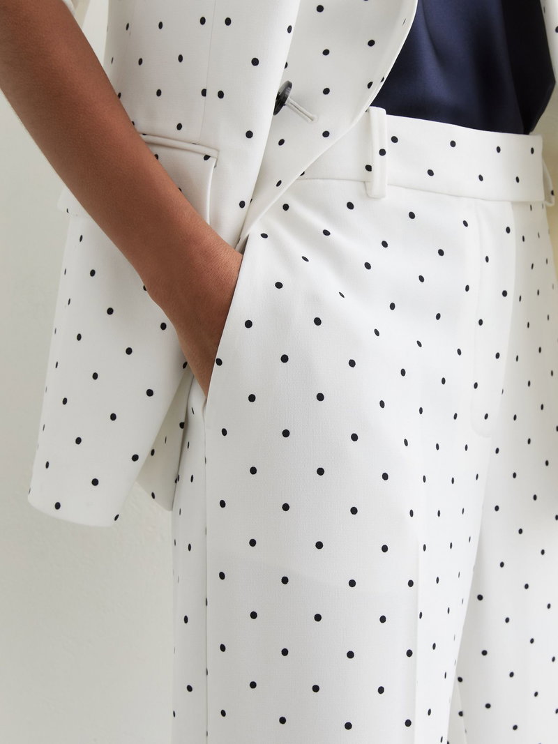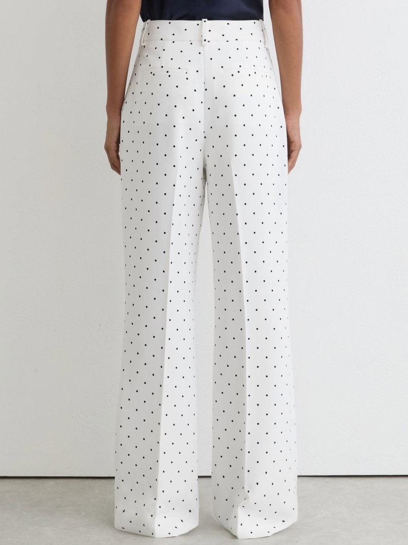 The White/Navy Beatrix trousers are tailored in a wide-leg silhouette with a playful polka-dot print. Pressed creases refine the shape, while a concealed front fastening creates a clean finish.