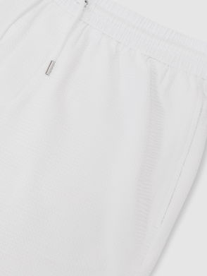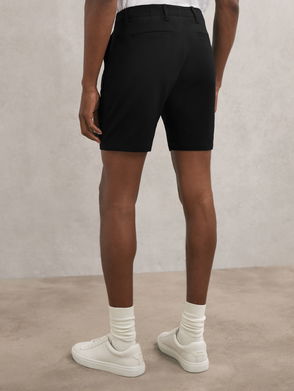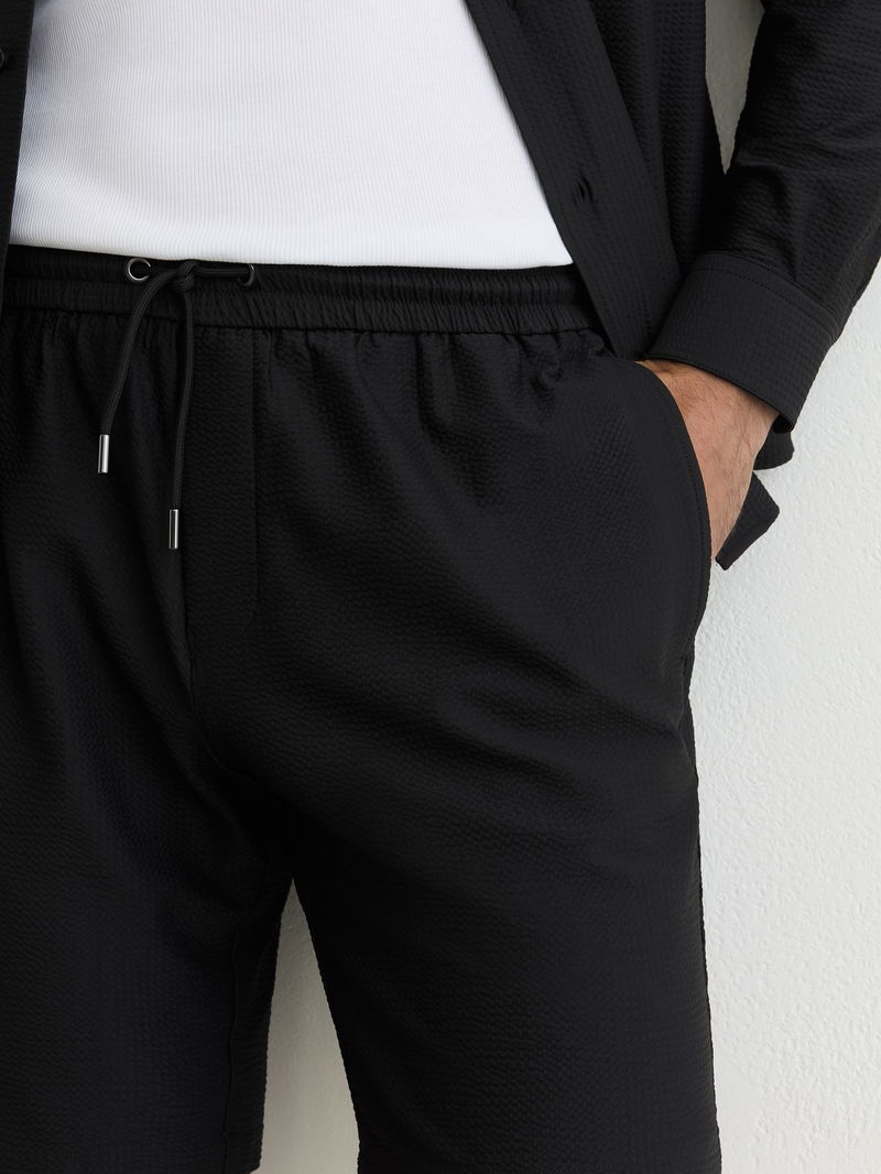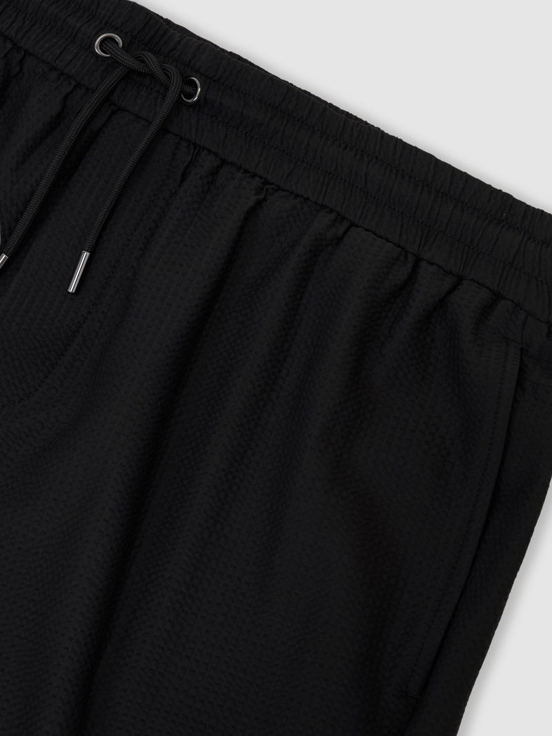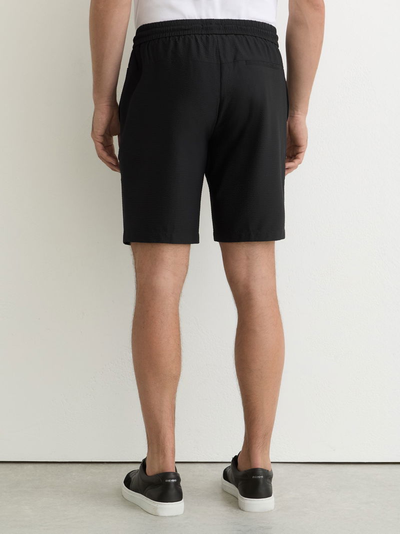 The Black Ajay shorts are crafted from stretchy, lightweight seersucker with a drawstring waist for comfort. Side slip pockets and a back welt pocket complete the casual look.