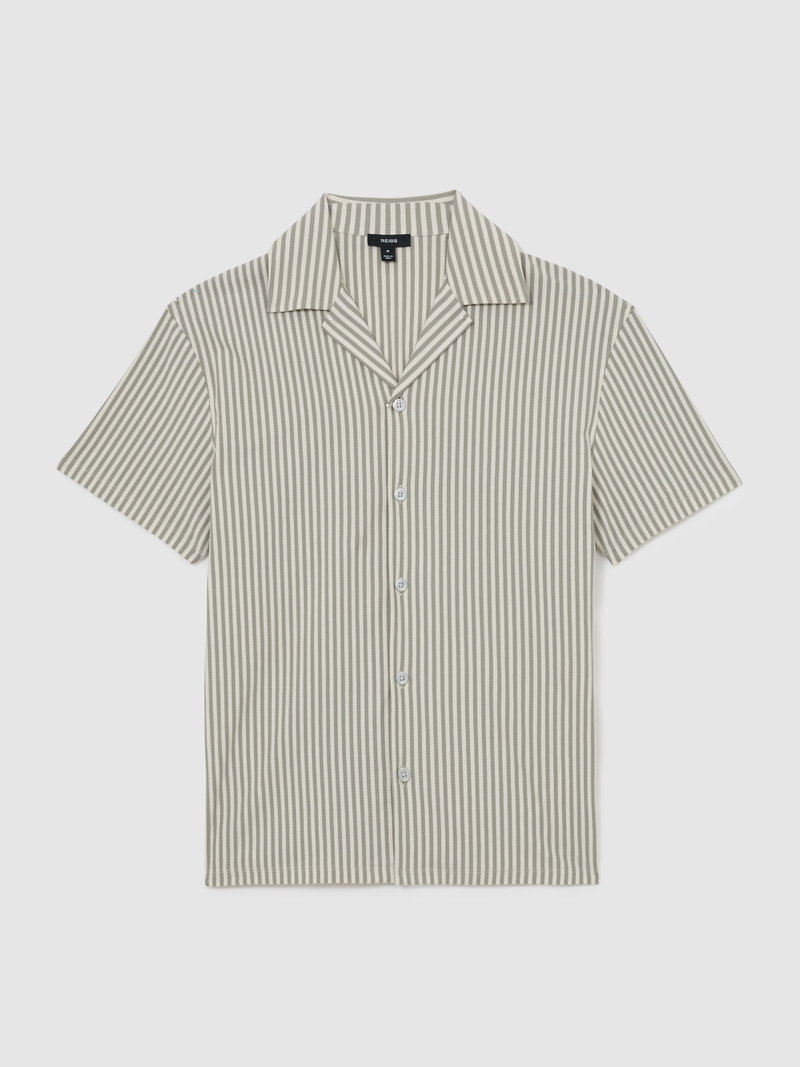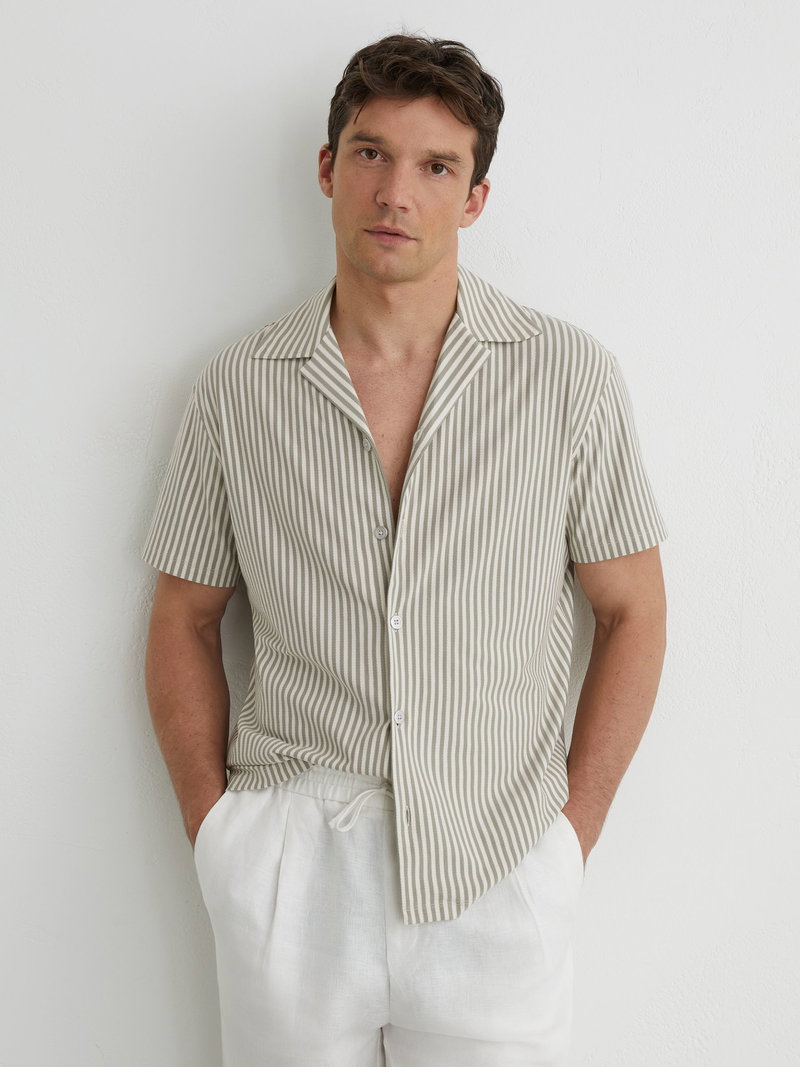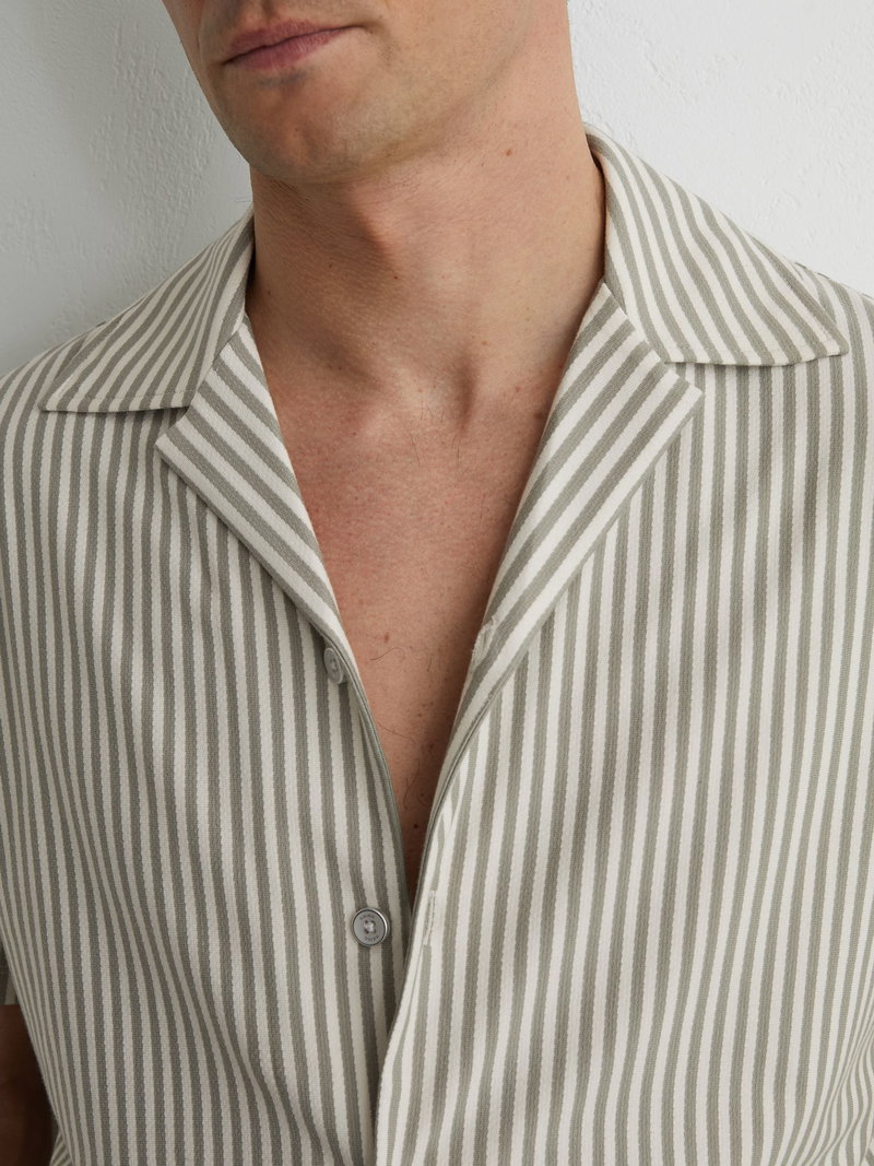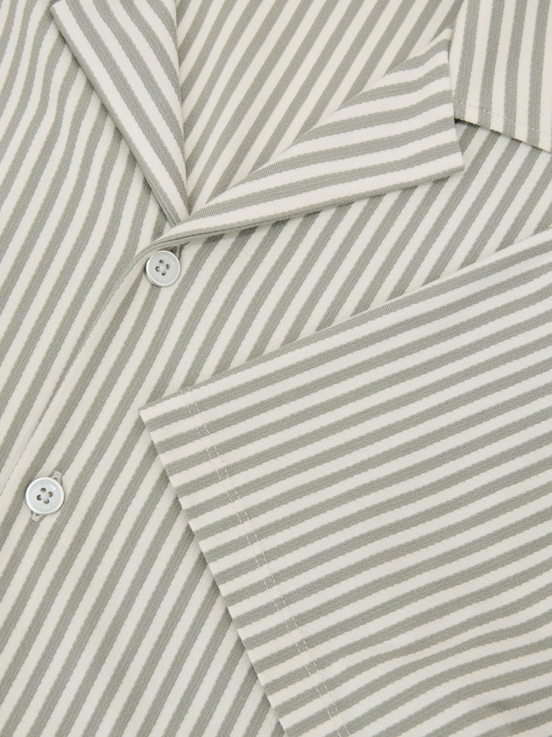 The Soft Sage Green Aurelia shirt is crafted from soft cotton-blend jersey with a lightly textured finish and classic stripes. A Cuban collar and short sleeves complete the summer-ready style.
