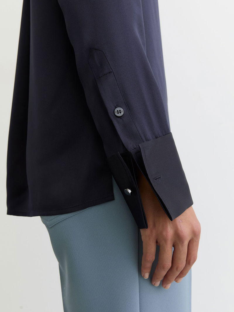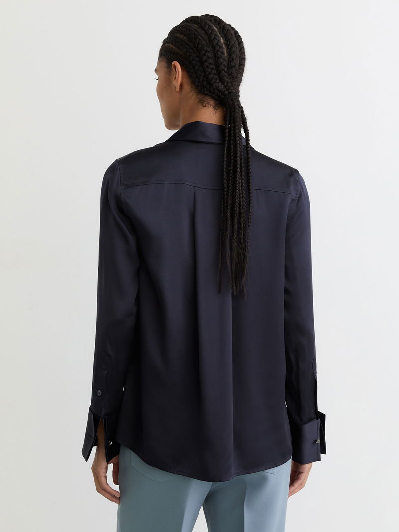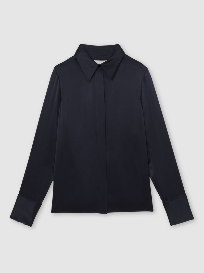 Silk-Satin Concealed-Placket Shirt In Navy
