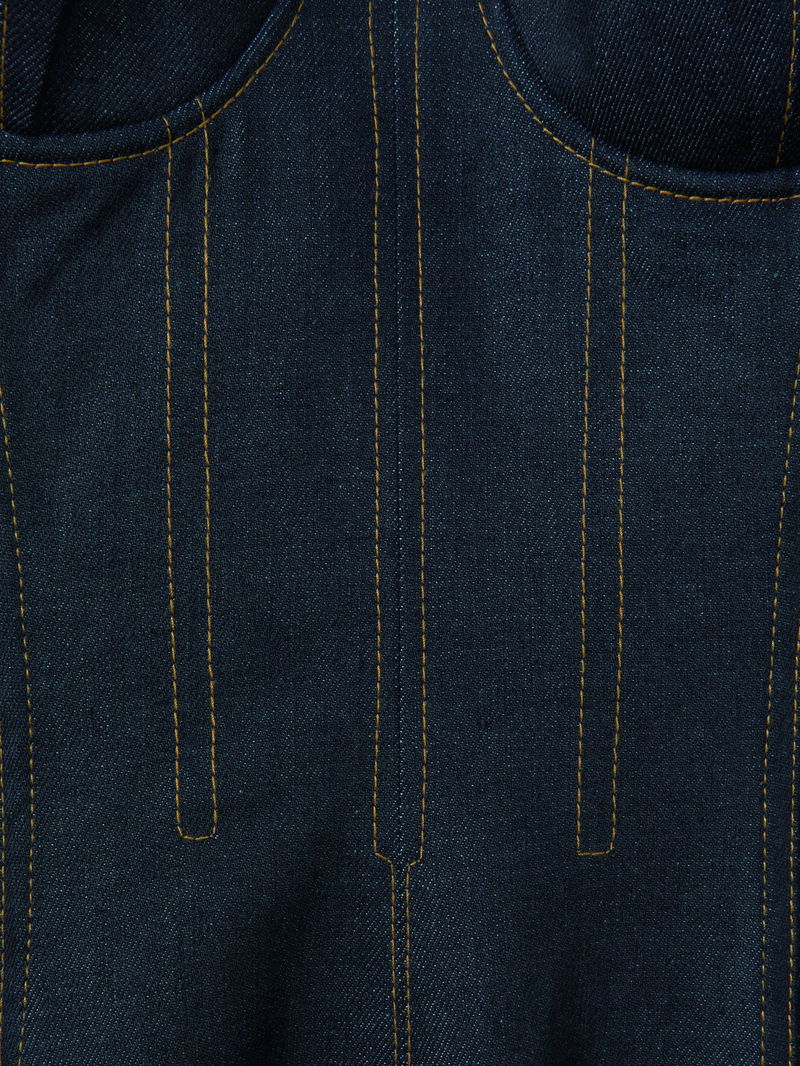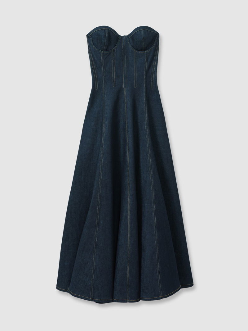 Strapless Structured Denim Midi Dress In Indigo Blue