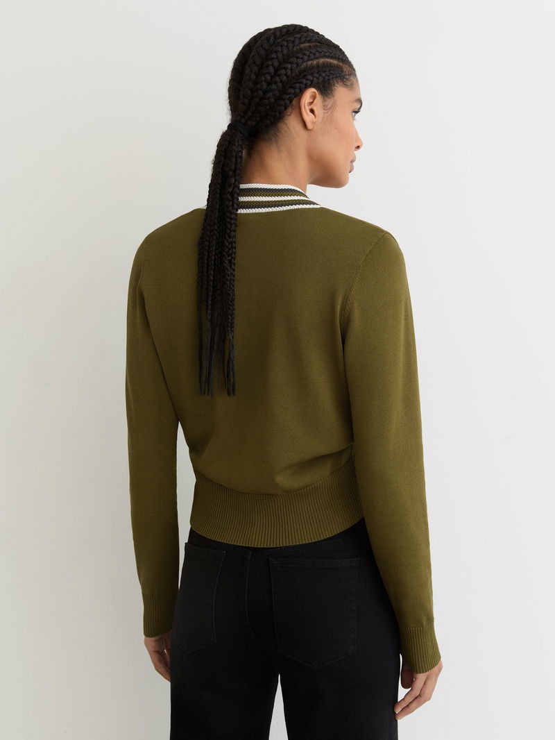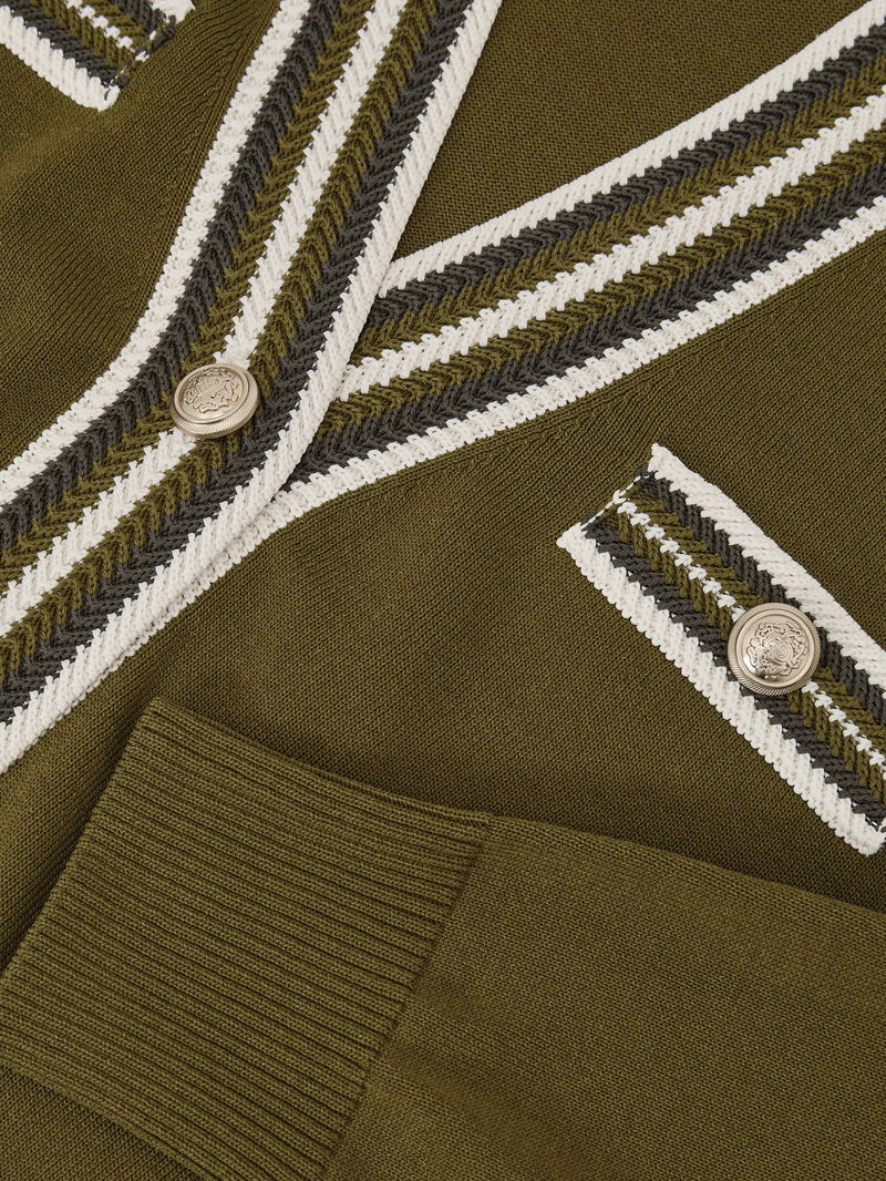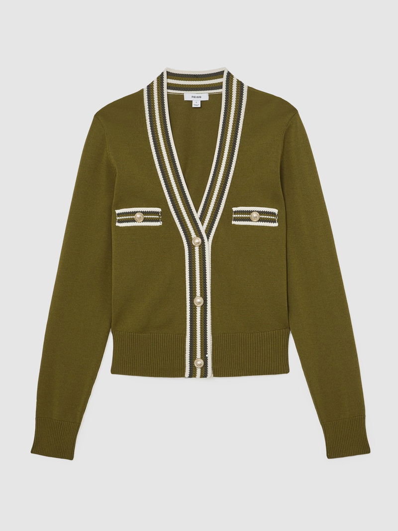 Tipped Button-Through Cardigan In Green/Ivory