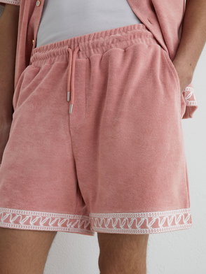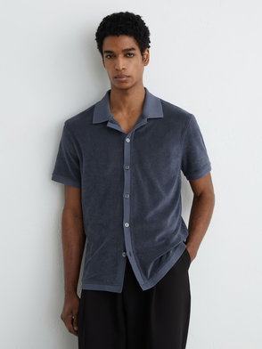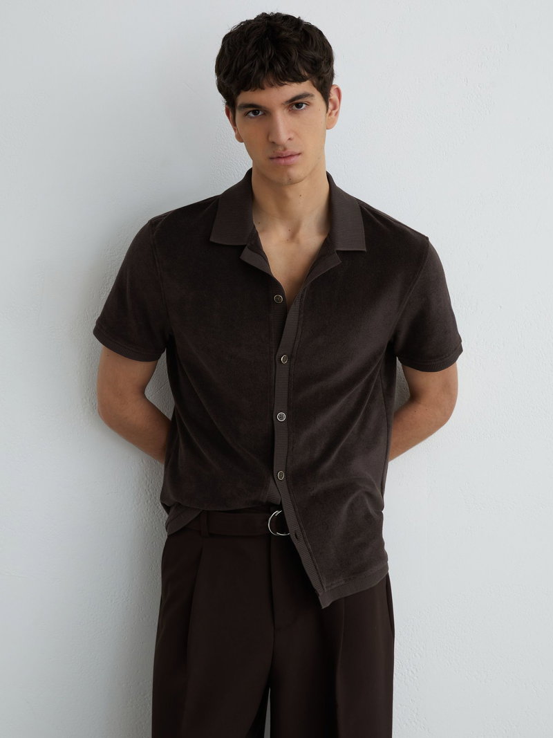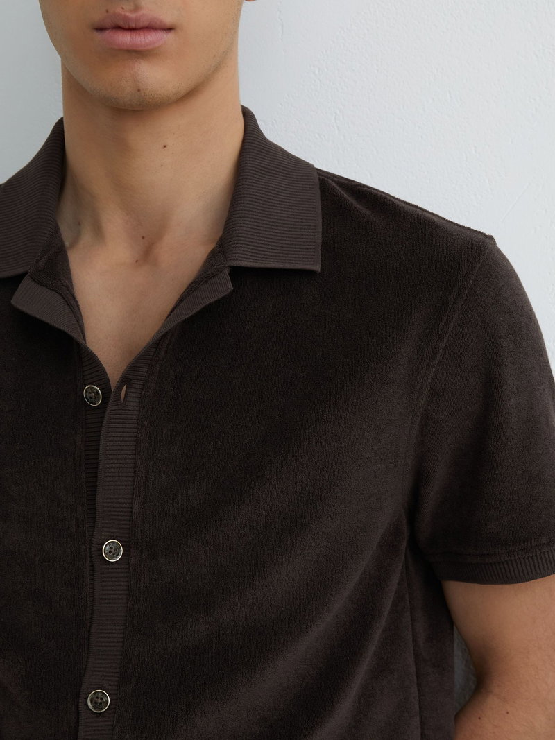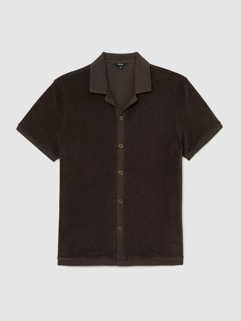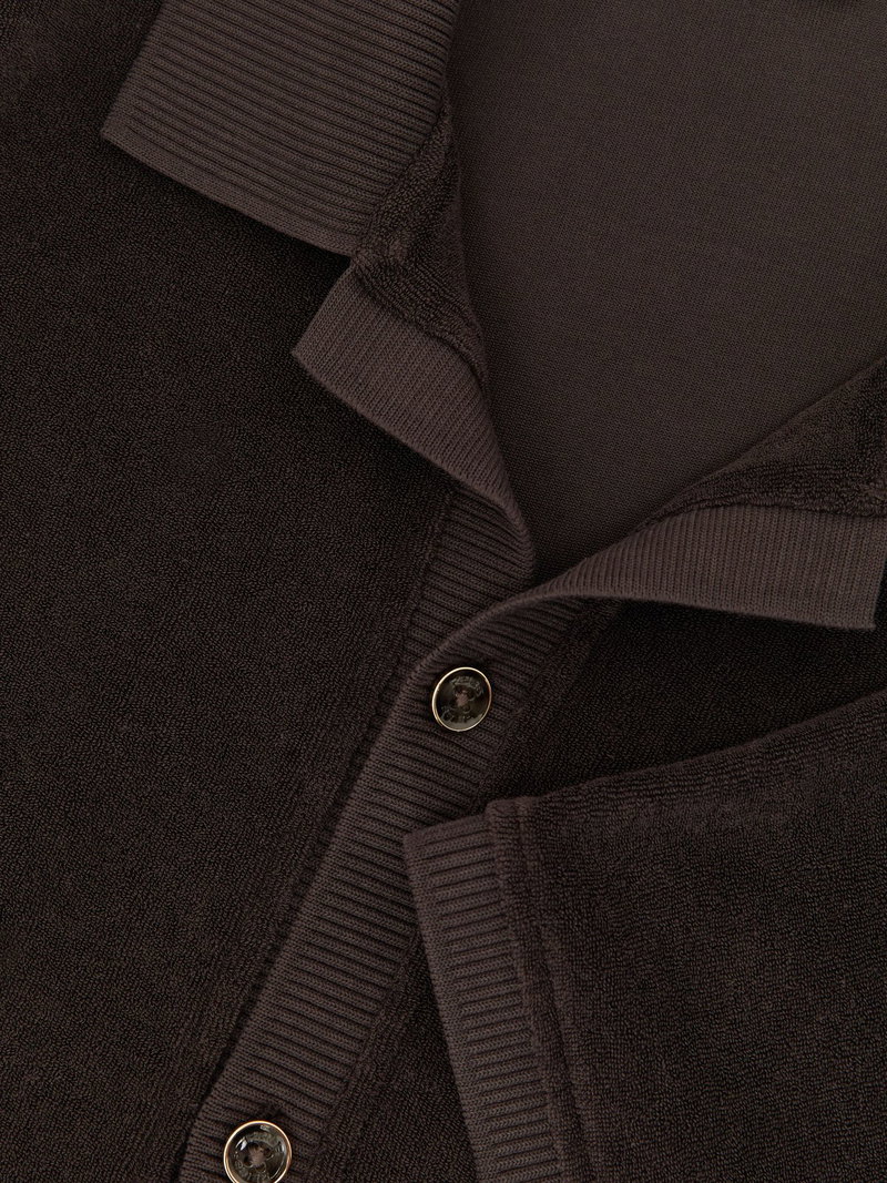 The Chocolate Brown Eden shirt is crafted from soft towelling with short sleeves for a relaxed, holiday-ready feel. A rib-knit Cuban collar and trims add subtle structure to the button-through silhouette.