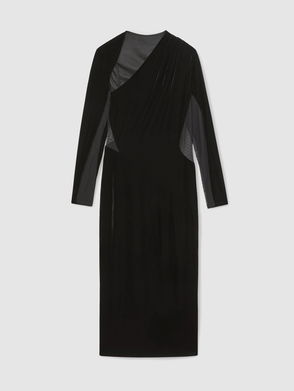 The Nara dress is crafted from plush stretch velvet, cut to a body-skimming mid-length silhouette. A draped high neckline wraps asymmetrically around the shoulders, with waist ruching and a back slit adding refined interest.