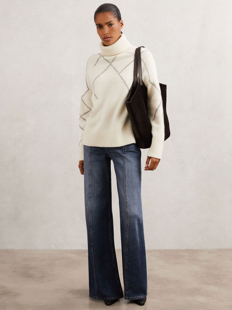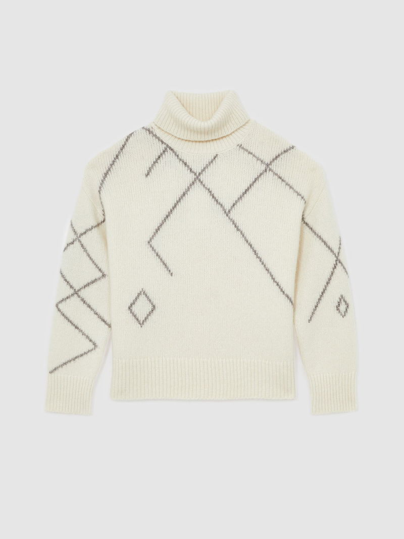 Wool-Blend Roll-Neck Argyle Jumper In Cream/Taupe Brown