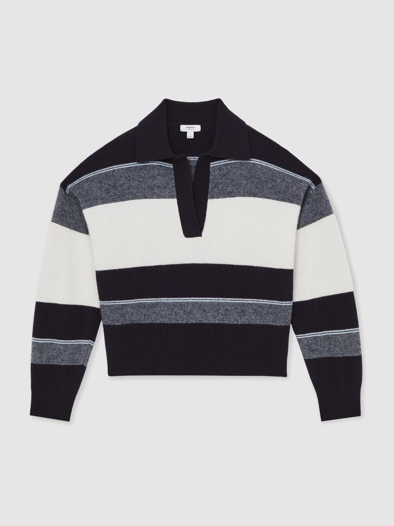 Wool-Cashmere Stripe Collared Jumper In Navy/Cream