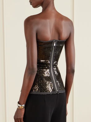 Aptly nicknamed The Lord of Darkness, Rick Owens brings gothic and industrial inspiration to avant-garde design. This bustier top is made from denim in a sequined silhouette.