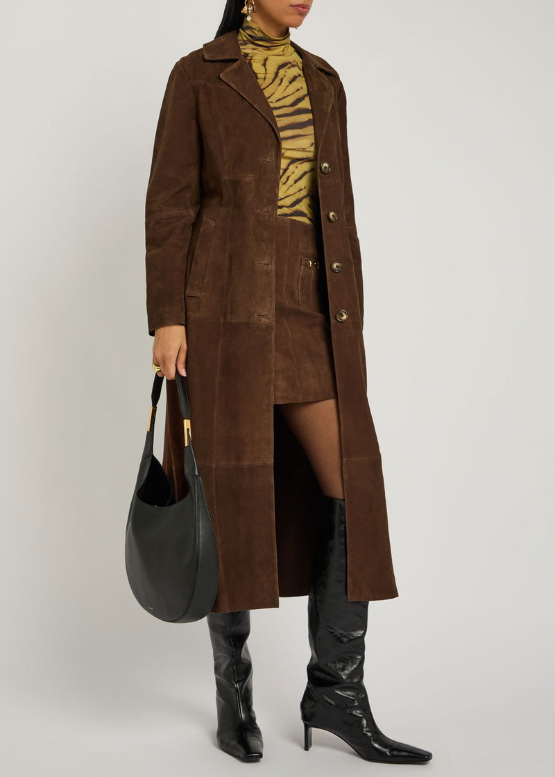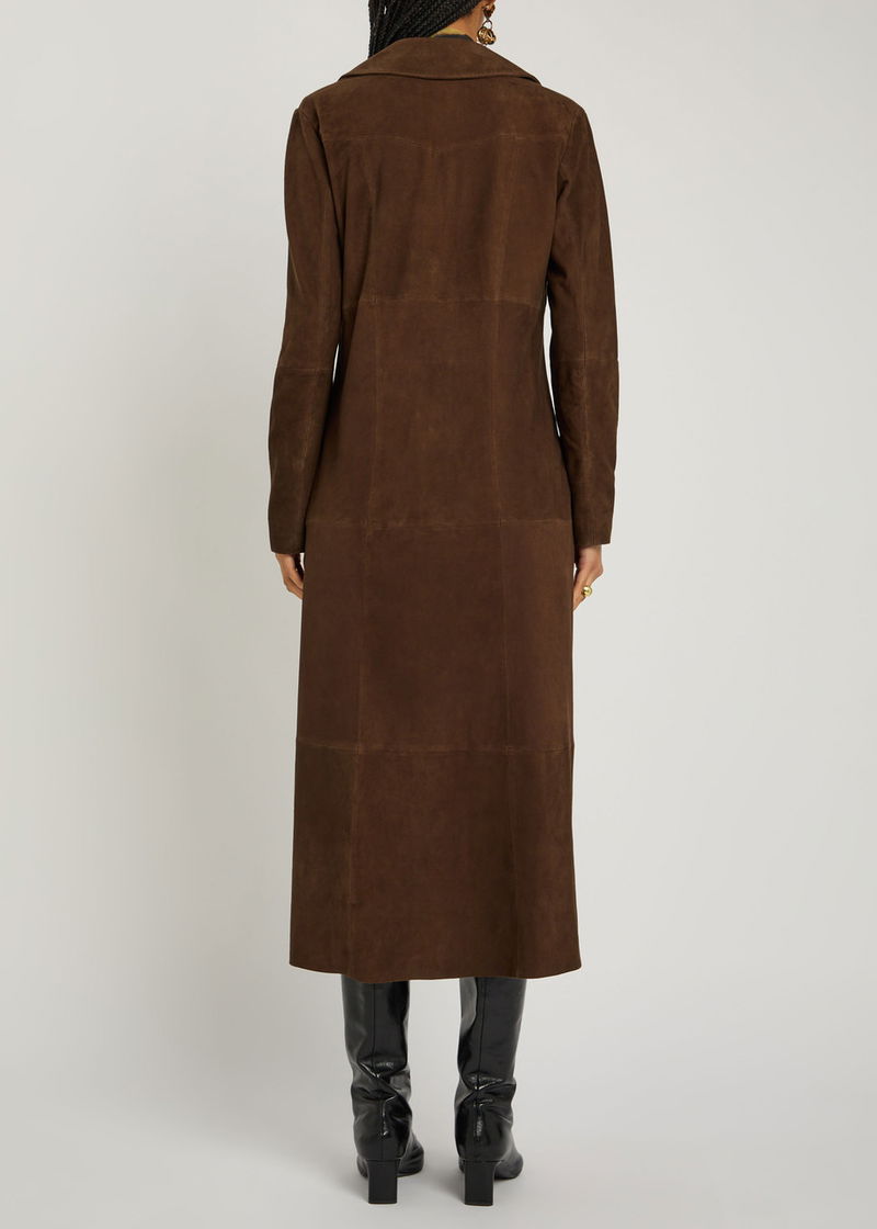 Rixo suede coat. Panelled, notched lapels, front slip pockets, partially lined. Button fastenings through front.