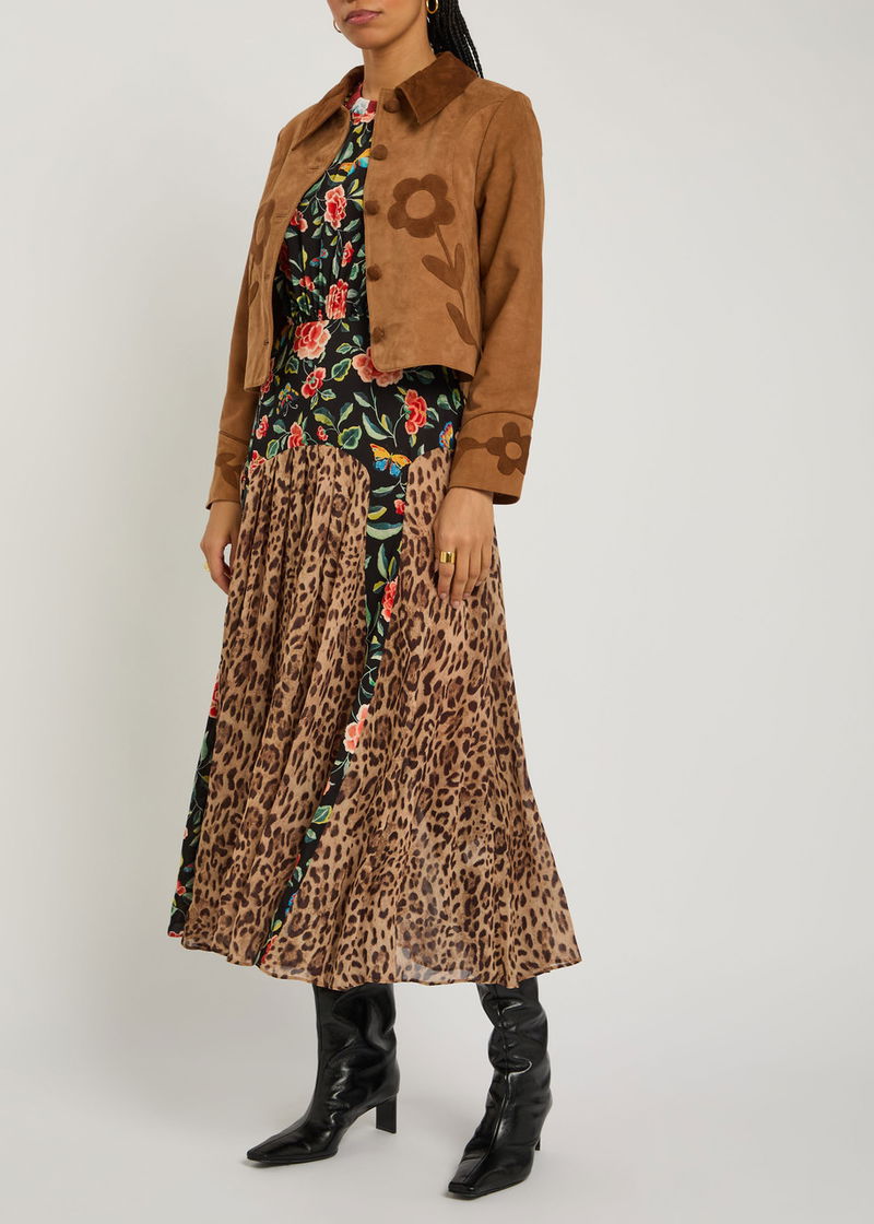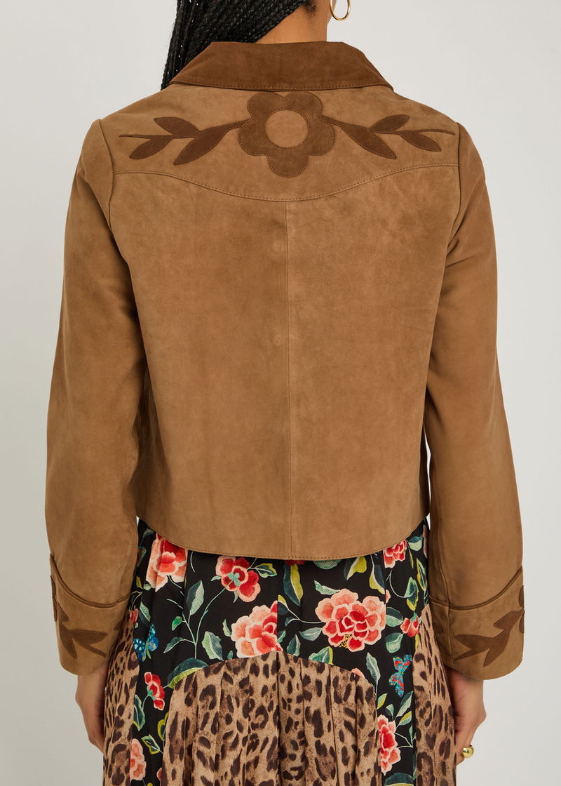 RIXO suede jacket. Floral embroidery, fully lined. Button fastenings through front.