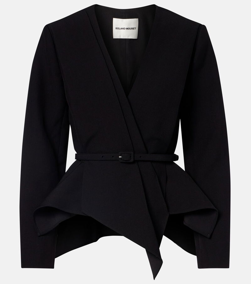 This blazer from Roland Mouret is cut from crêpe to an asymmetric silhouette. The design is defined by a structured drape and peplum detailing, complemented by a detachable tonal belt around the waist.