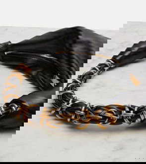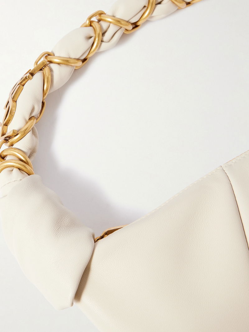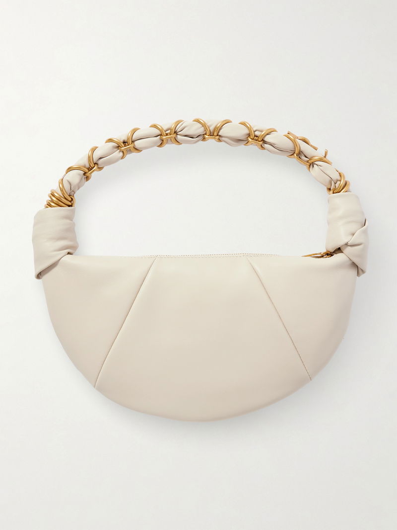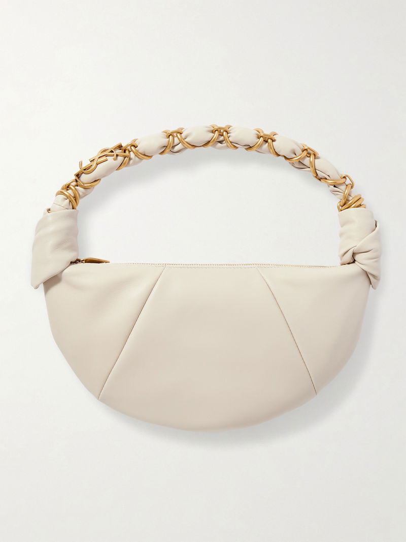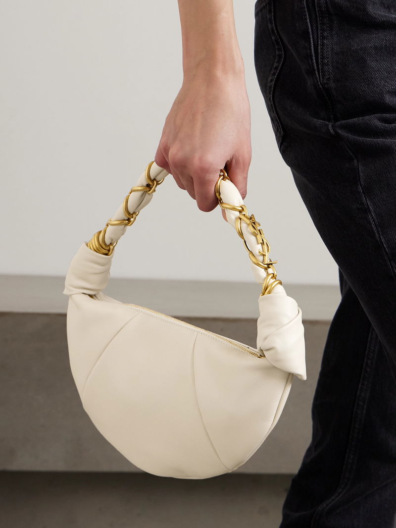 It's made from smooth leather in a slouchy shape and has knotted details at the sides. Stow your phone, lipstick and cardholder inside.