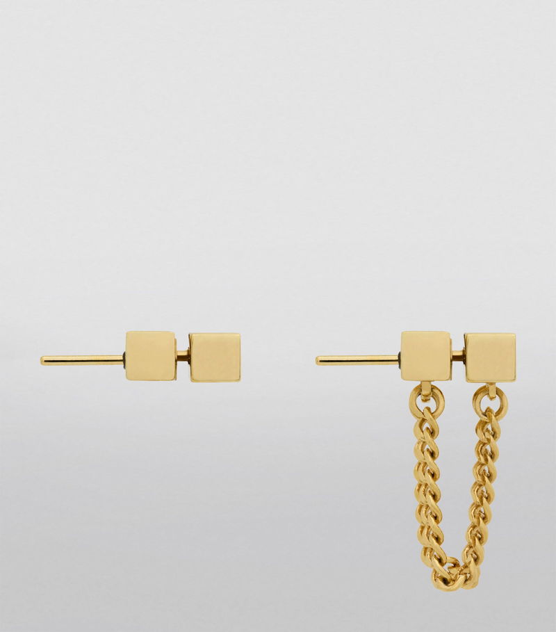 Saint Laurent lends its rock 'roll' influences to its jewellery line this season, as evidenced by these mismatched earrings. In signature antiqued gold, one of two metal plates is engraved with the Maison's moniker and strung with a chunky chain for a finish that nods to '70s punk culture.