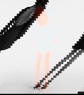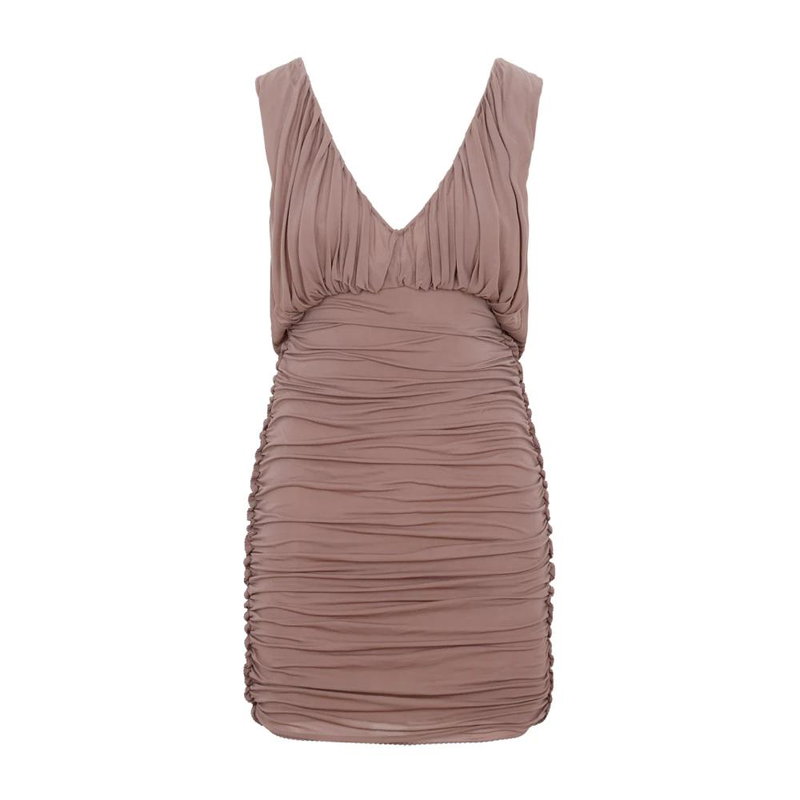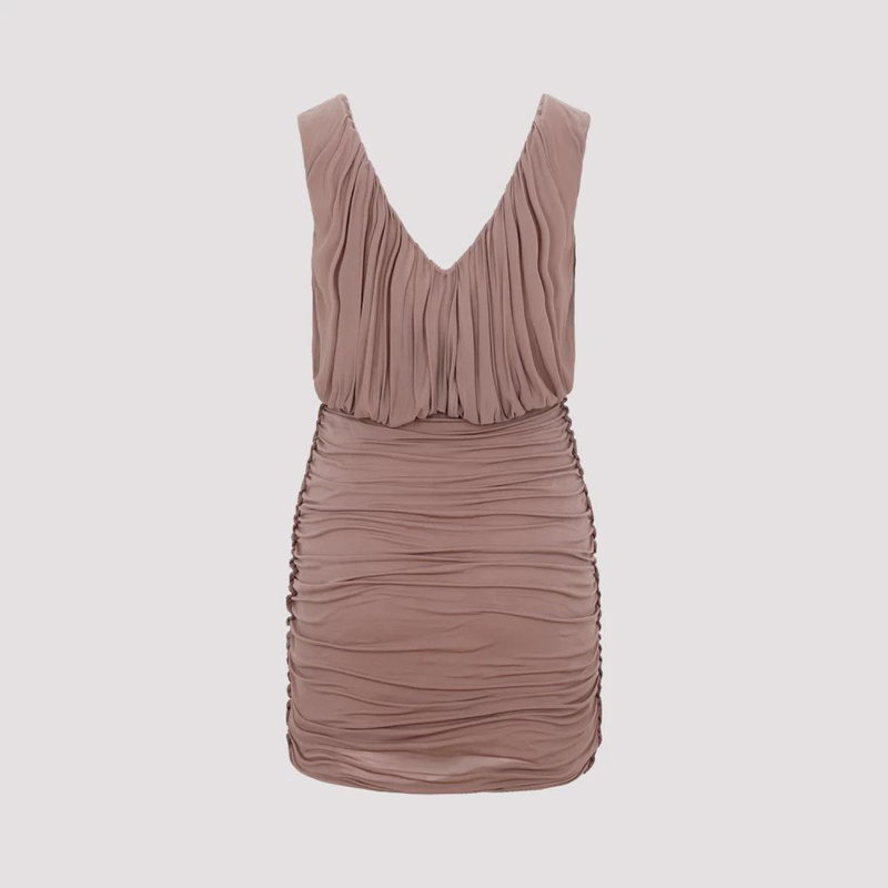 Saint Laurent Gathered Mini Dress crafted in cupro with a plunging V-neck and gathered construction. A sleek mini for evening or refined daytime looks.