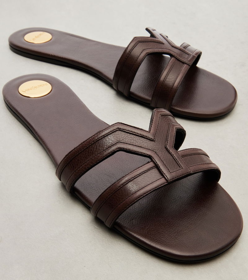 Since its conception in 1961, Saint Laurent has been coveted for its elegant Parisian aesthetic. The Mabrouka flat sandals are crafted from grained leather and boast logo-engraved plaques in a refined golden hue on the insoles.