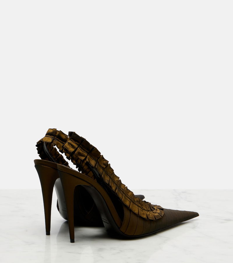 Complete ensembles on a sophisticated note with the Madeleine pumps from Saint Laurent. Crafted from silk taffeta, the slingback pair features hand-sewn couture ruffles, pointed toes, and stiletto heels.