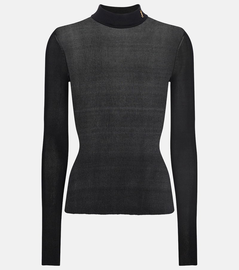 Saint Laurent is a byword for sensuality, and this mockneck top more than meets with this attribution. In a fine silk knit made in Italy, the long-sleeved design has a ribbed, body-forming silhouette that's ever so slightly sheer in finish. The house's iconic YSL monogram rests on the turtleneck in golden metal.