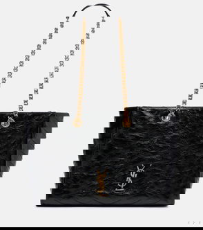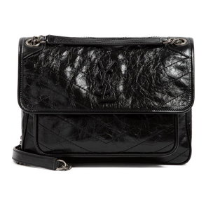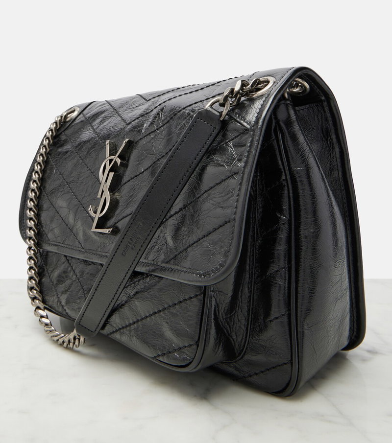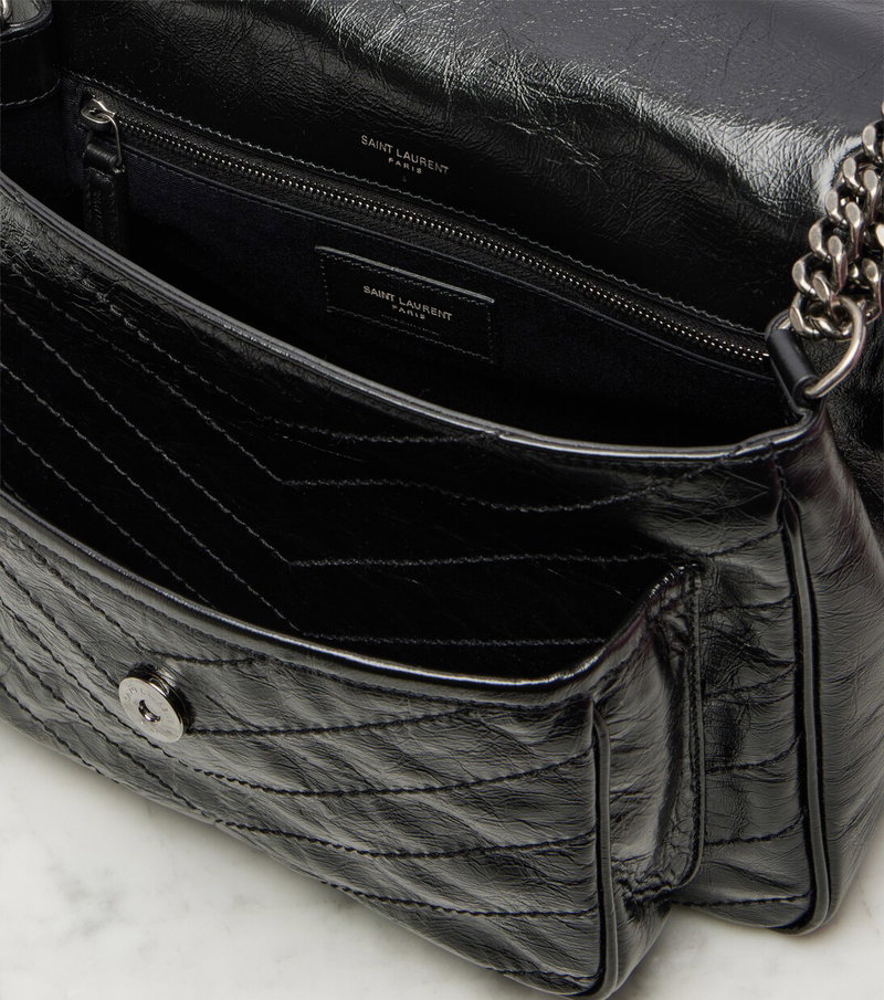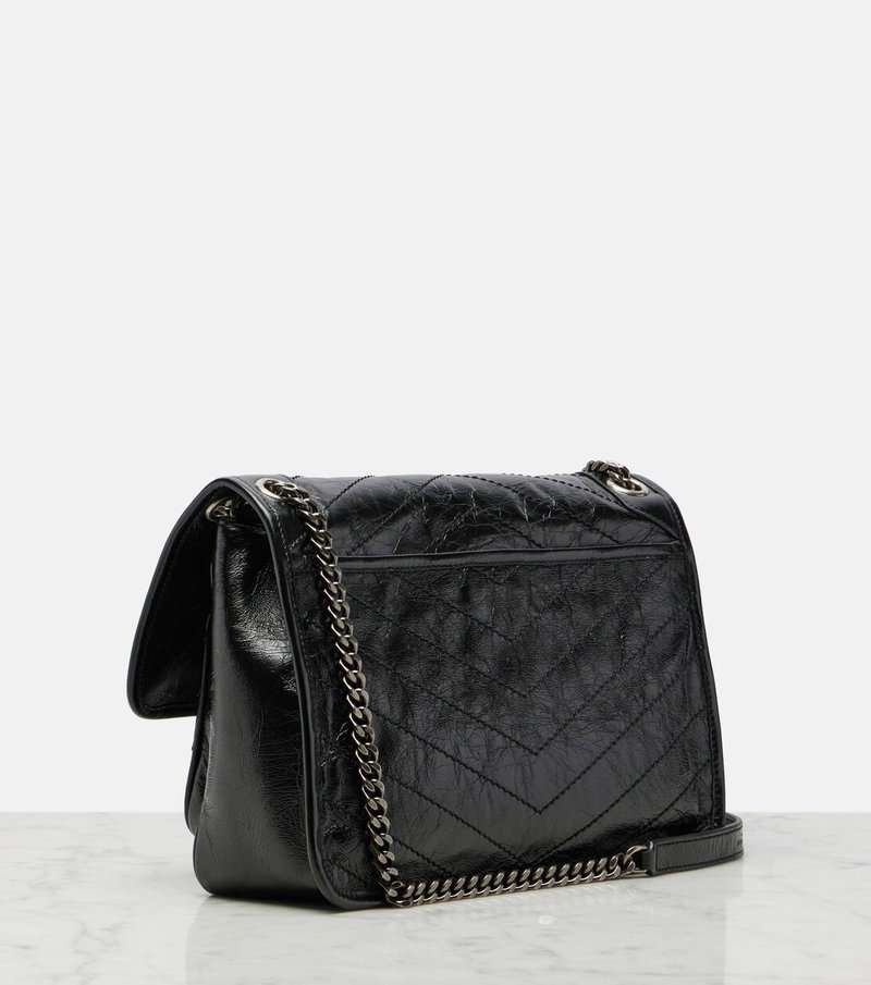 The Niki Medium shoulder bag from Saint Laurent is crafted in Italy from crinkled leather, with an aged, sheeny finish, and features signature chevron stitching. The design is detailed with the iconic Cassandre hardware and a double chain-and-leather strap for hand or shoulder carry.