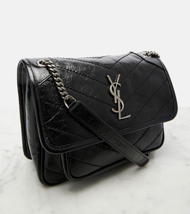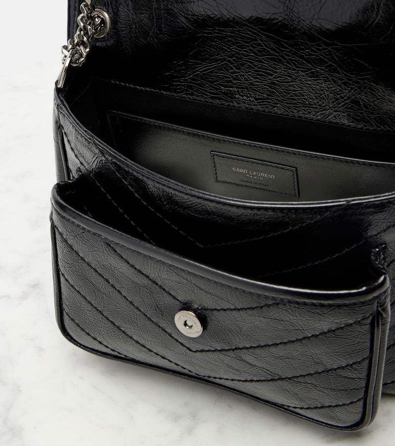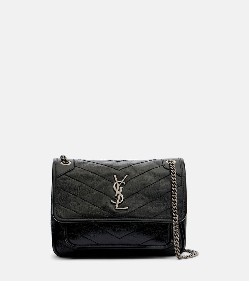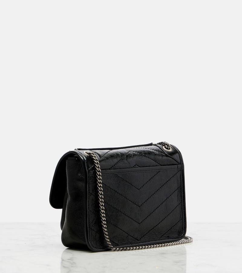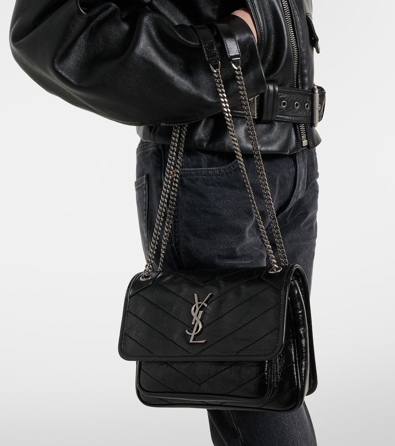 Since its conception in 1961, Saint Laurent has been coveted for its elegant Parisian aesthetic. Italian-crafted from leather, the Niki Mini crossbody bag features iconic Cassandre hardware, a chain strap, and dazzling embellishments.