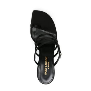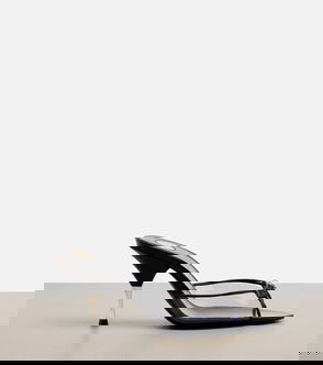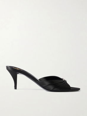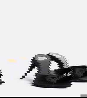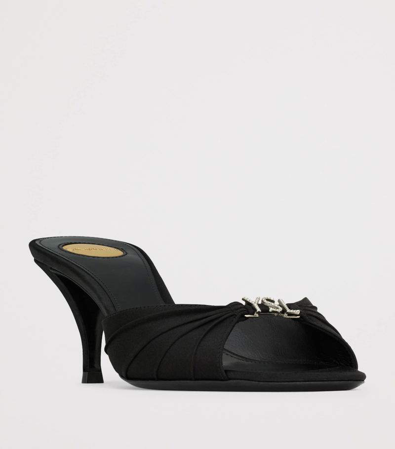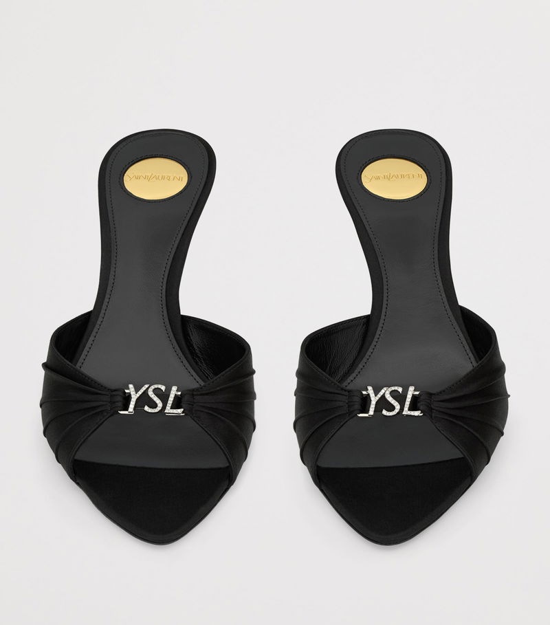 The Jerry mules are a study in elegance, with their polished satin construction and slender vamp that culminates with a crystal-embellished logo.