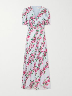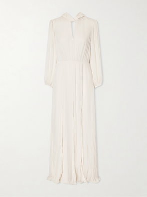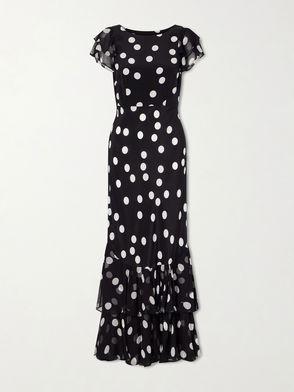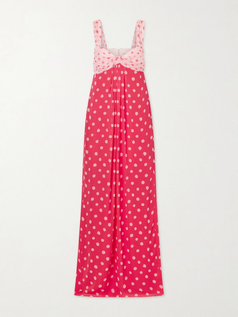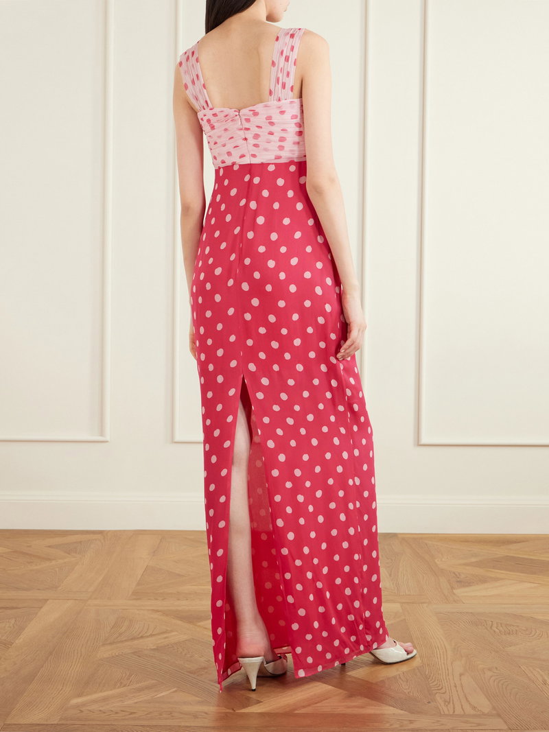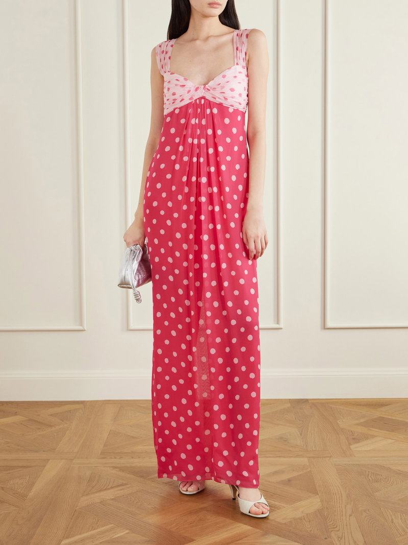 Self-Portrait’s ‘Chani’ dress is patterned with a romantic polka-dot print. It gathers softly at the crepon bust before falling into a fluid, pleated silk-chiffon skirt, while the inverse colorway lends a playful yet refined finish.