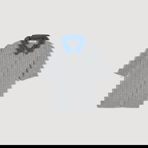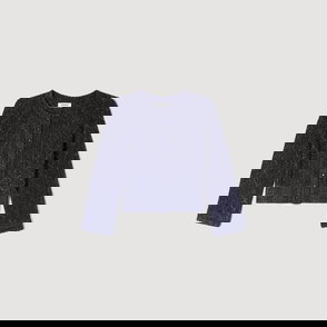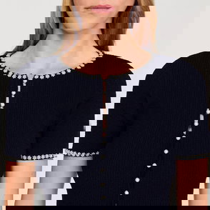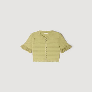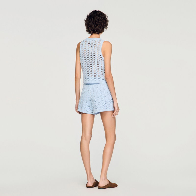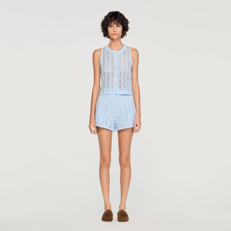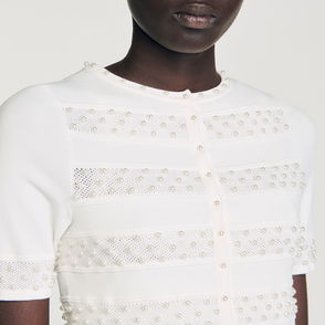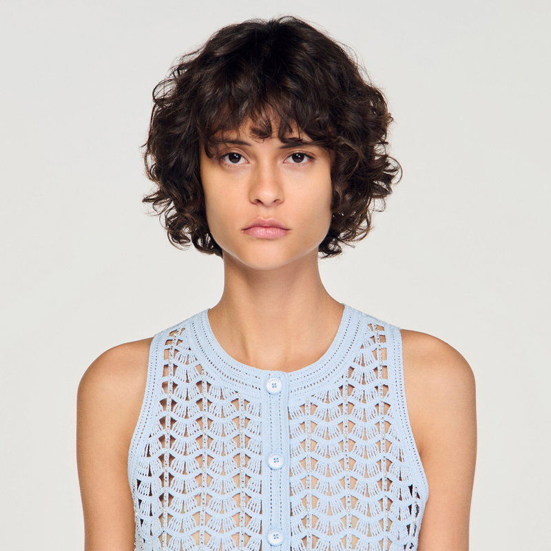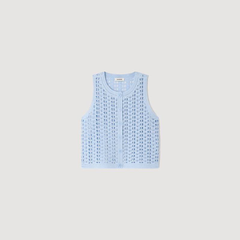 Sleeveless crochet cardigan with pearls, round neckline and geometric pattern.