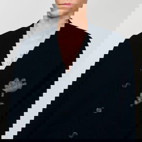 Double jersey long-sleeved knit cardigan with round neck and an appliqué flower patch on the chest.