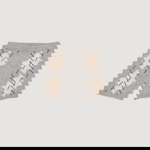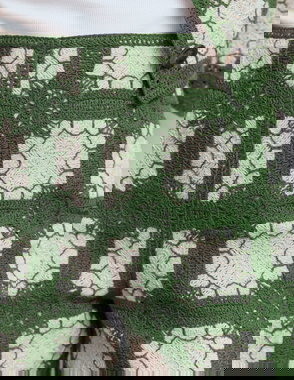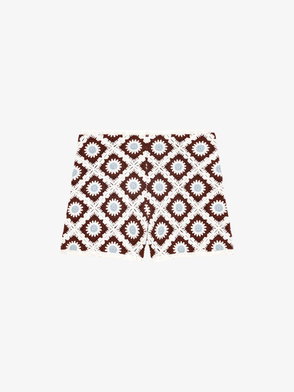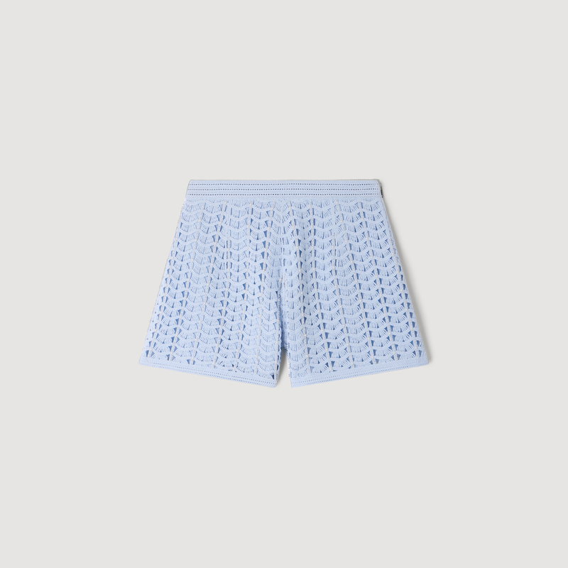 Short flared crochet shorts embellished with pearls, featuring a high waist and a side zip fastening.