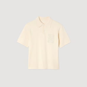 Rib-knit polo shirt with lapel collar and short sleeves.