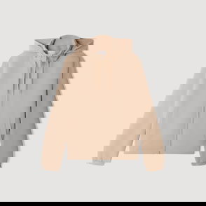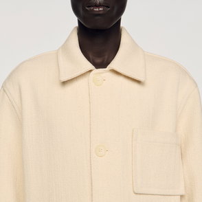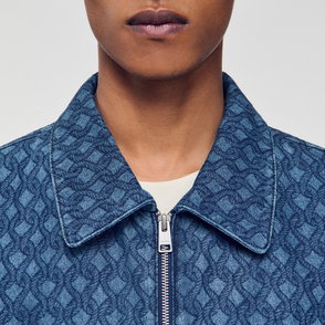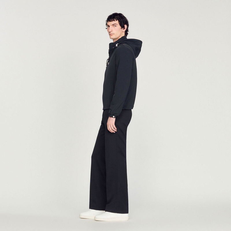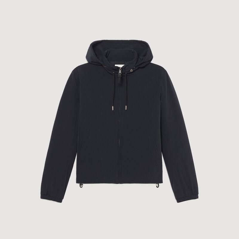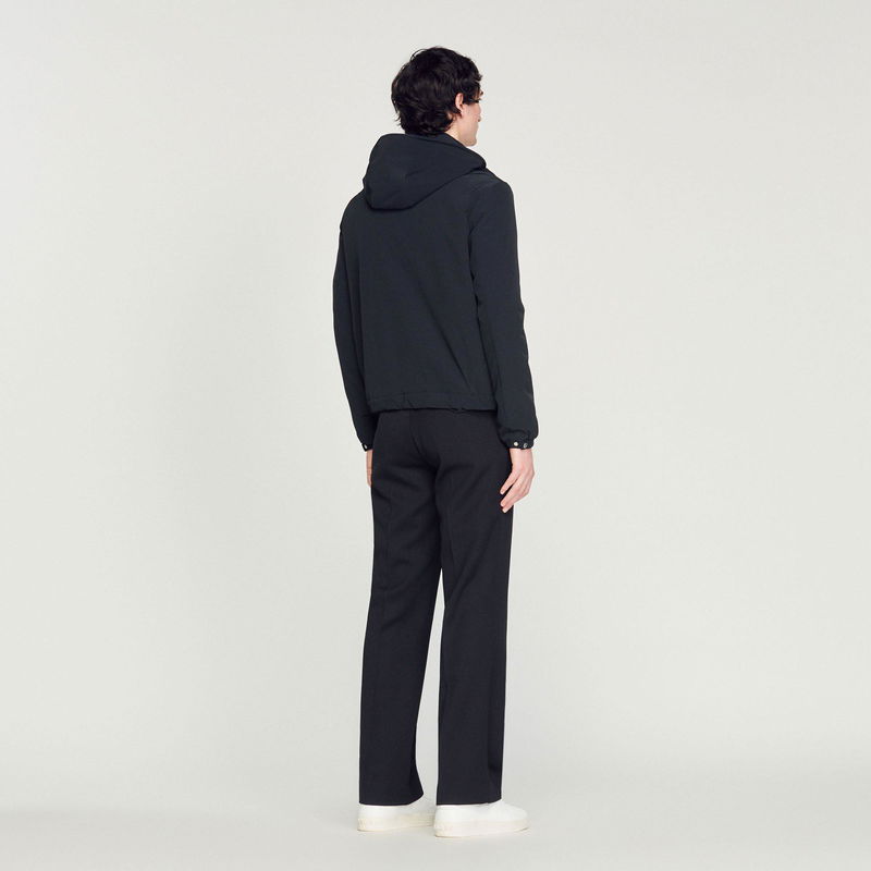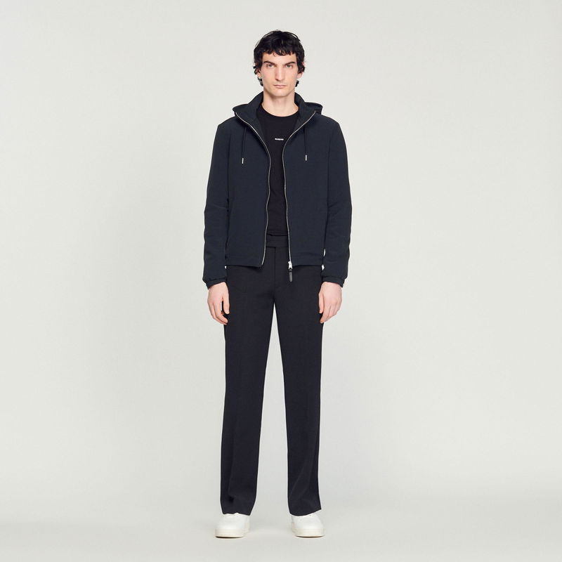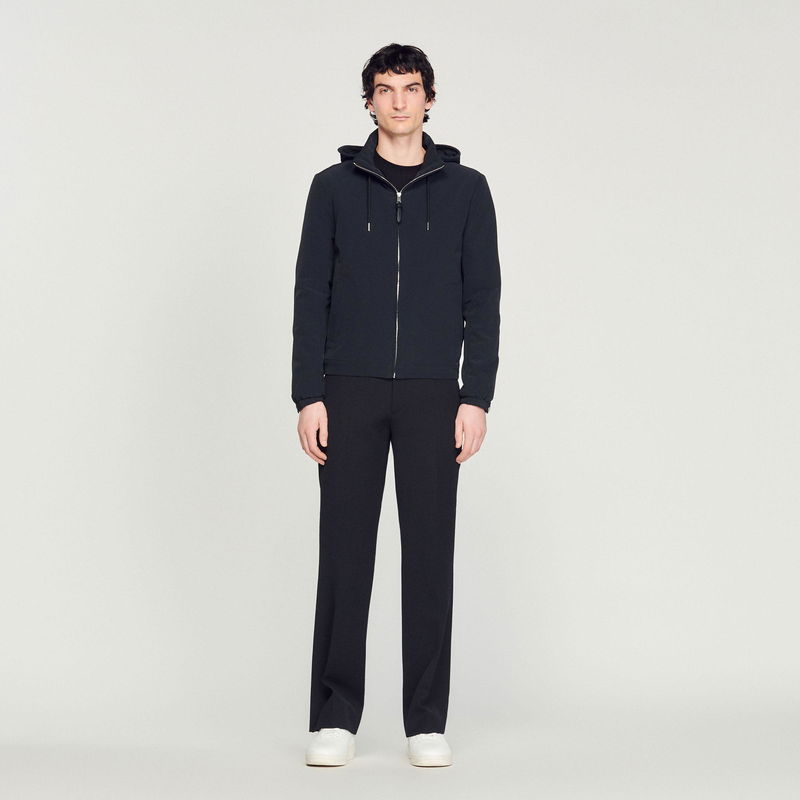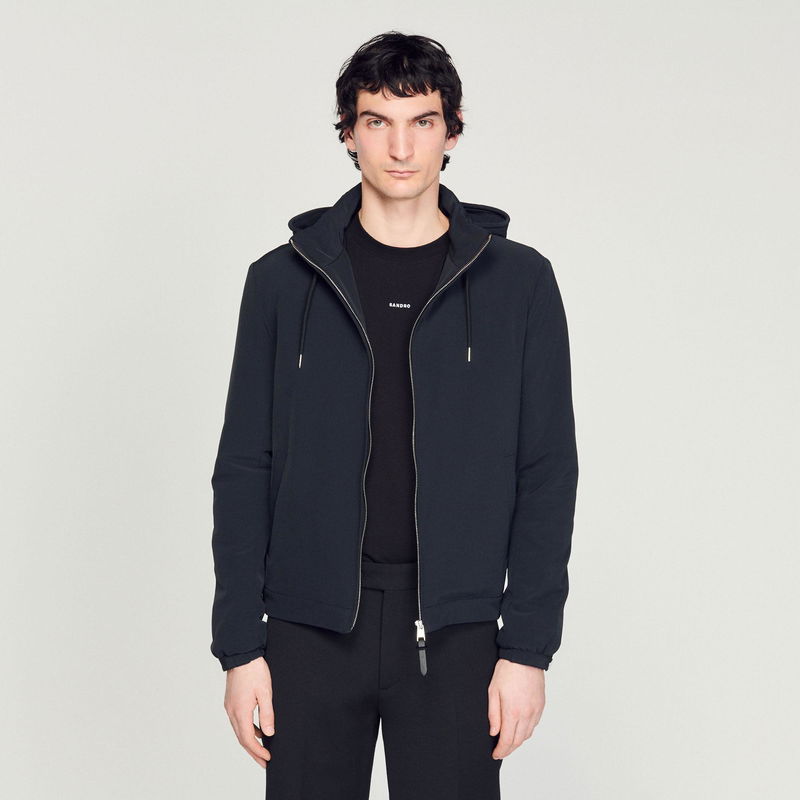 Sandro men's jacket. Technical fabric jacket. High zipped collar with hood. Drawstring hood. Zipped front opening. Piped pockets on the front. Cord lock at the hem. Elasticated cuffs with adjustable tab.